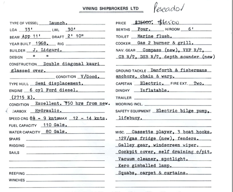 “The WW story about ‘Pascador’ – A Southern Woody certainly brought back some fond memories for our family. I have also noticed Pascador in the Motueka Marina looking very smart and well looked after – she is a real credit to her current owner. The last time I visited the area I also took a photo of her to show my father who owned her back in the early 1980’s. I have good memories of taking my very young family out cruising on her in the Sounds at the time. Not long after dad sold her she went to Havelock and was lengthened by the next owner to create a bigger cockpit. At this time I owned Vining Shipbrokers Ltd and we had her listed, probably late 1980’s. Early this week I visited the Vinings Office and owner Ian Michel has done a great job of keeping the records from back in my early days. He has digitized all the old typed up listings so good to find a listing for Pescador in the system. As you can see, she was a quality design & build by John Lidgard back in 1968 … the good thing is she looks in better shape now than back then.”