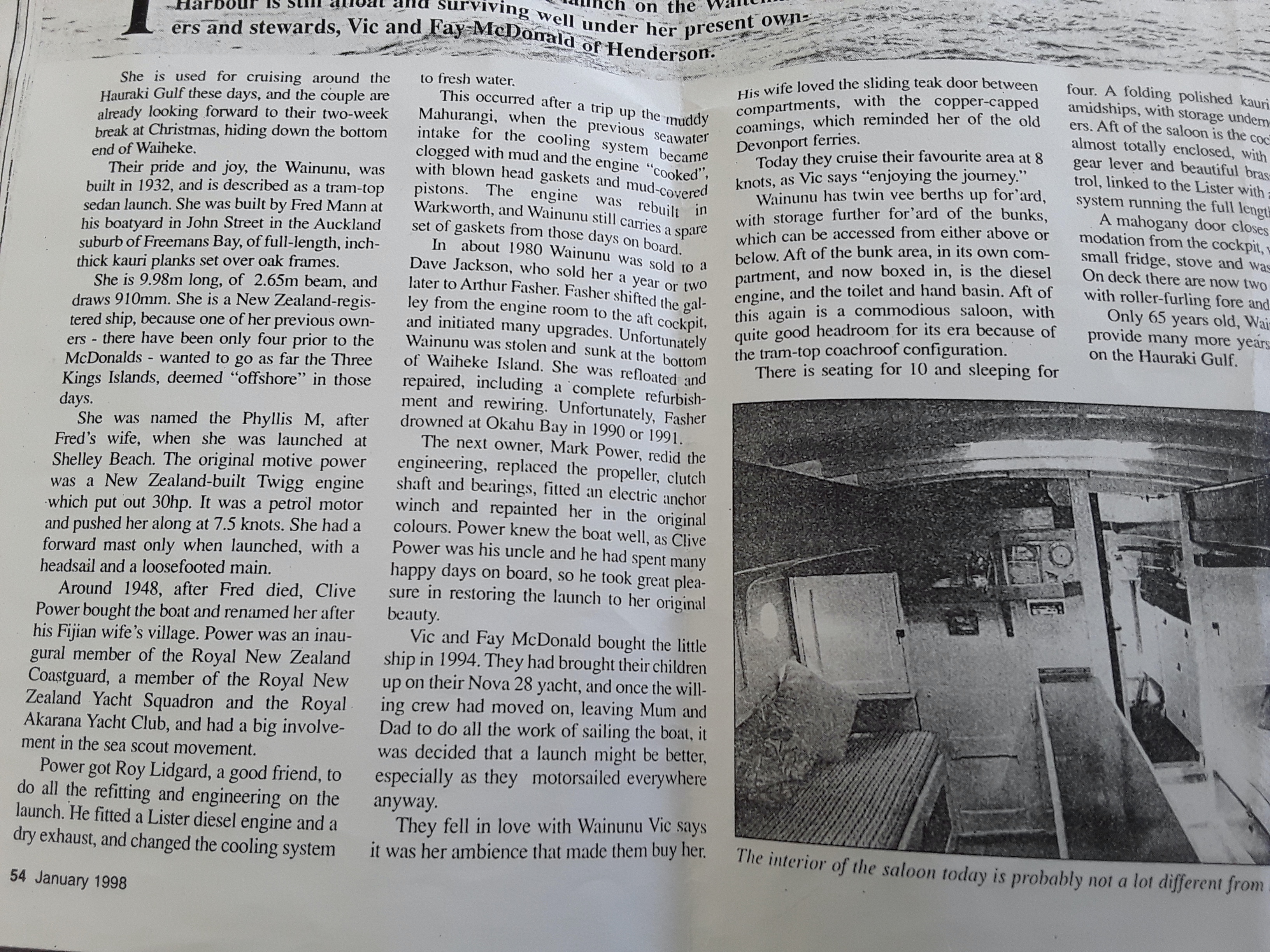 Back in 2016 the launch Phyllis M popped up on WW and was harshly listed as a finalist in the Husqvana Chainsaws Boat of the Year Awards. She popped up again in 2020 looking very smart after receiving a ‘top chop’. From these stories we learnt from Harold Kidd that she was built by Fred Mann in 1919 and named Phyllis M, when sold in 1953 her new owner, Clive Power, who renamed her Wainunu, and then later changed back by another owner to PM. Search either name in the WW search box for more details and photos.