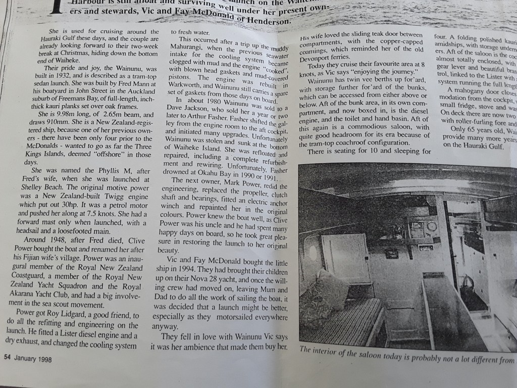 In the previous WW story Harold Kidd advised that Phyllis M was built by Fred Mann at John Street, Ponsonby in December 1919 for himself. After Fred died in 1945 she was sold to Clive Power who renamed her Wainunu. I understand many years later Keith Munro, changed her name back to as launched.