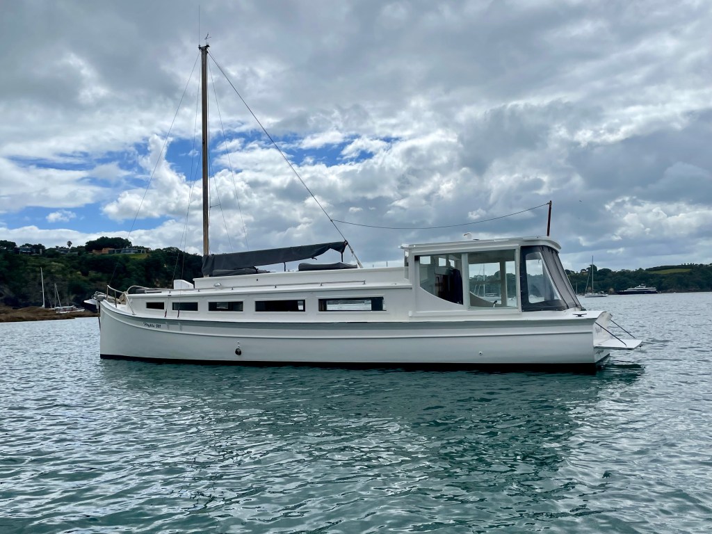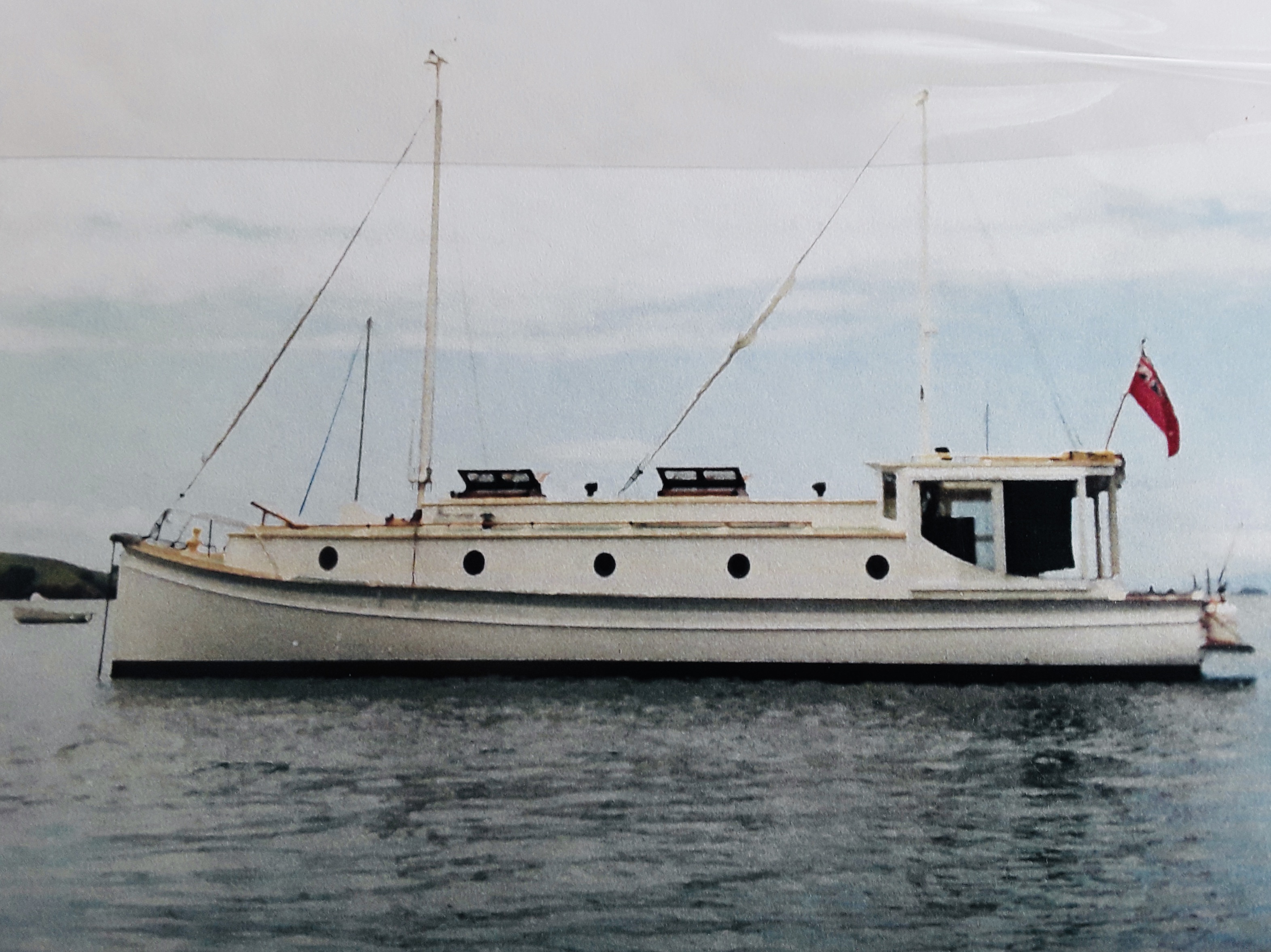 In the photo above Phyllis M / Wainunu is seen during the McDonld’s ownership period. Vic commented on the original butterfly wing hatches, brass portholes and 2 masts with roller furling sails. The Lister engine had a dry exhaust from the top of the forward mast.