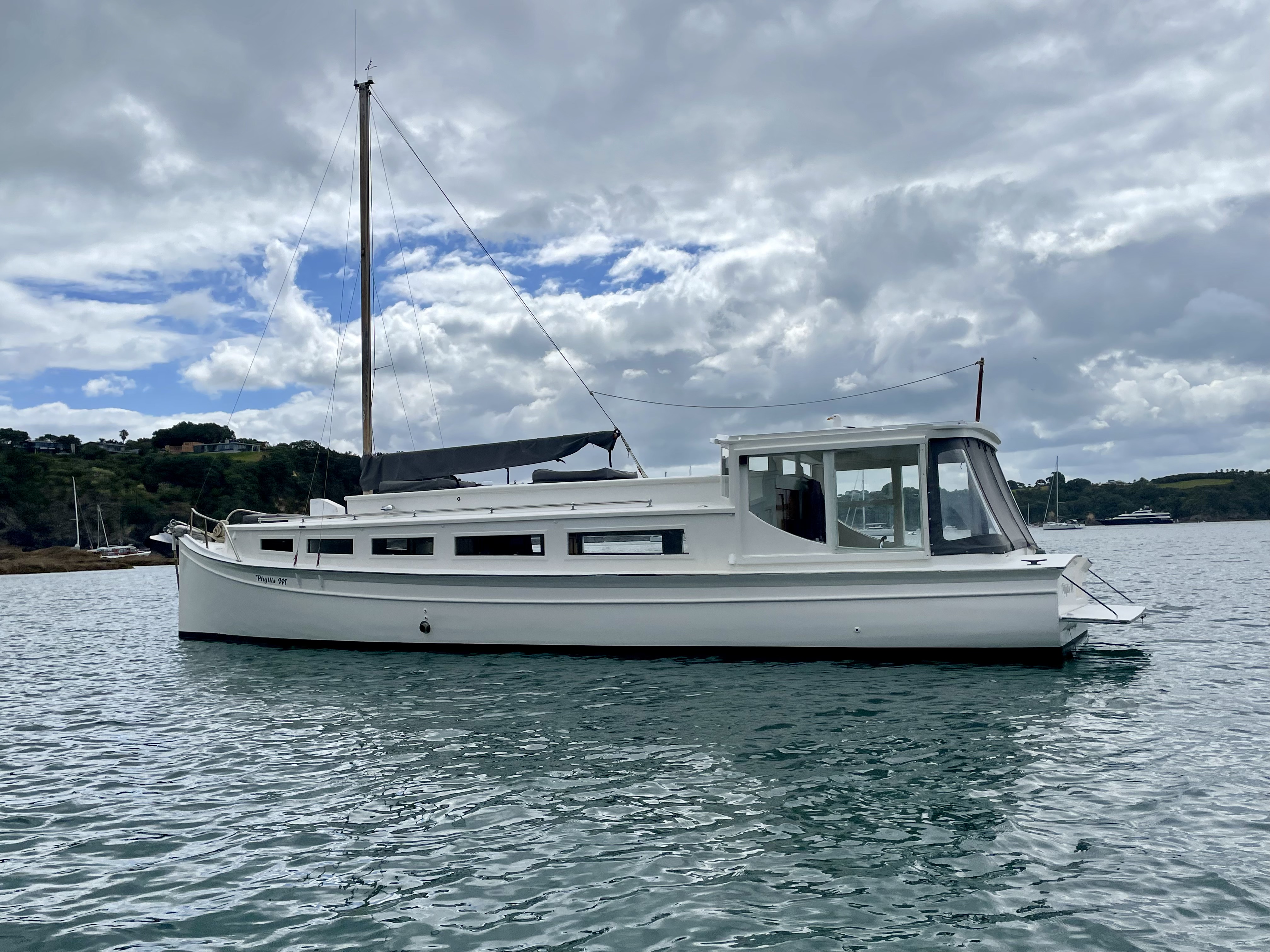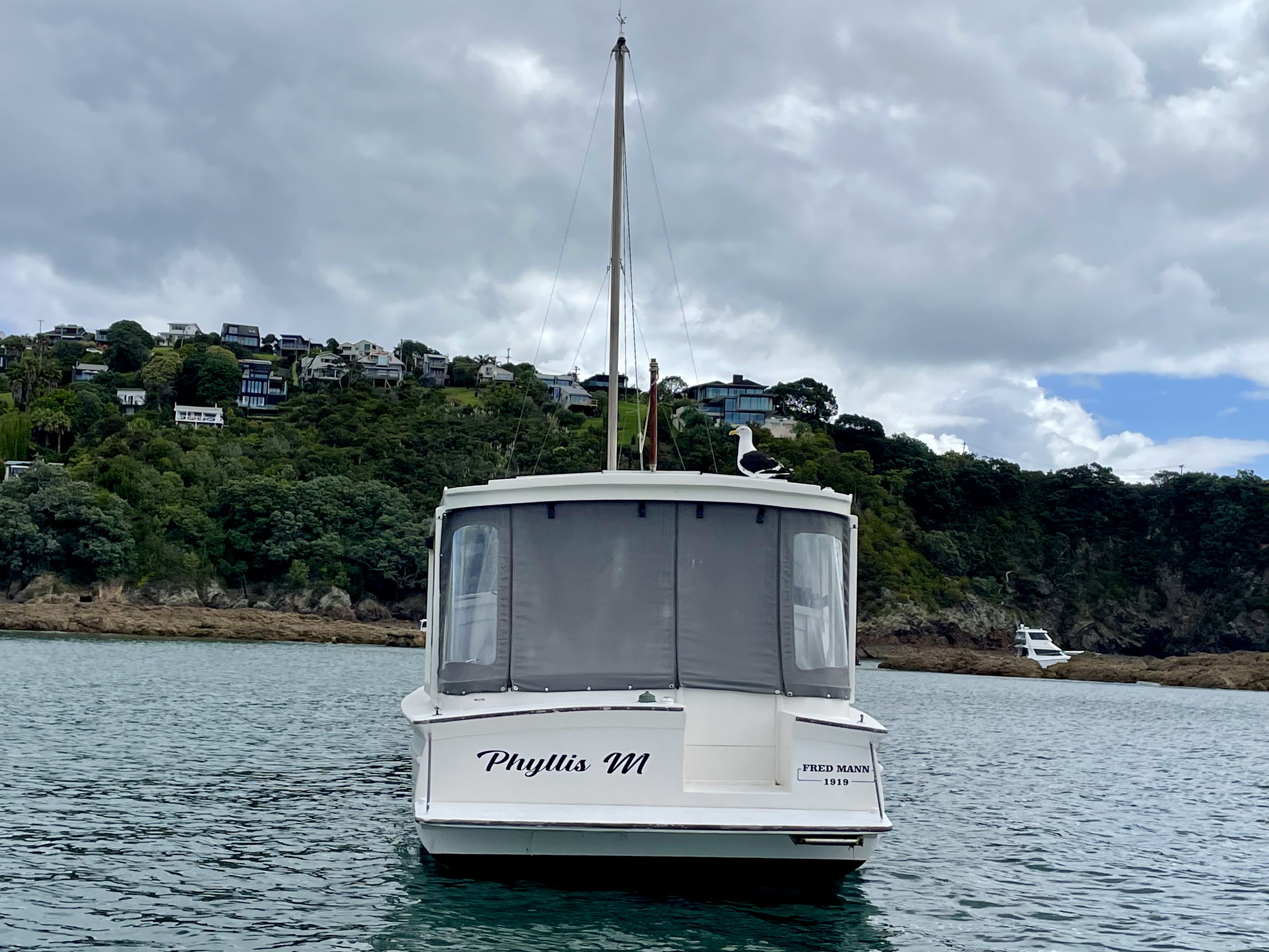 Phyllis M Goes Topless Back in June 2016, I posted a photo of the launch Phyllis M with rather a large addition to her dog-house, photo below, at the time it created interesting chat re the +/-’s of the addition. Link below https://waitematawoodys.com/2016/06/25/phyllis-m/