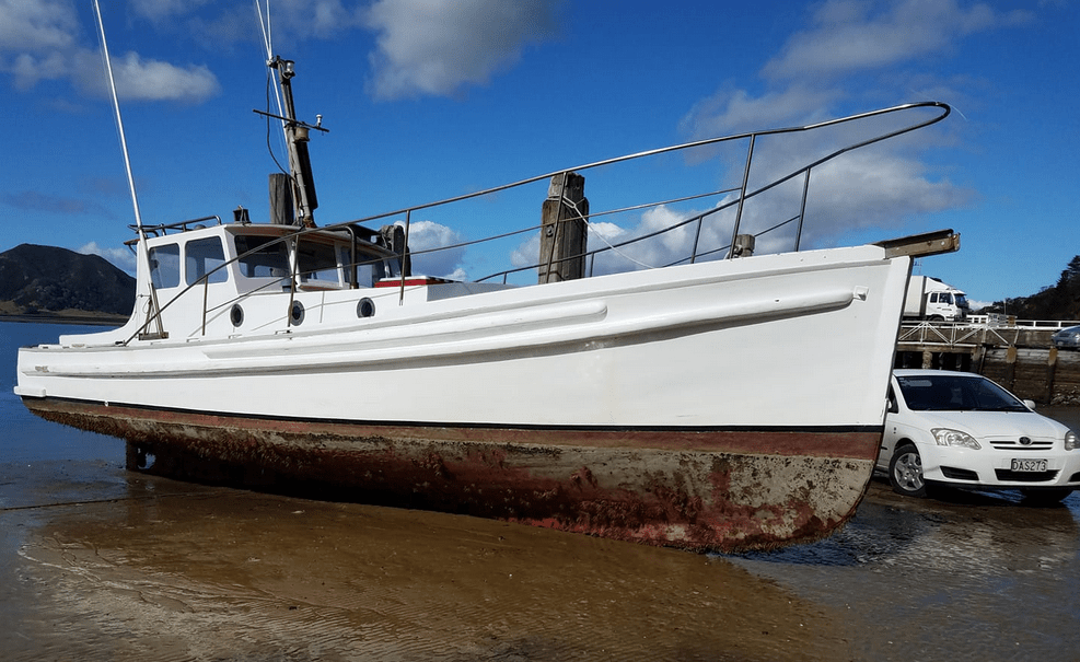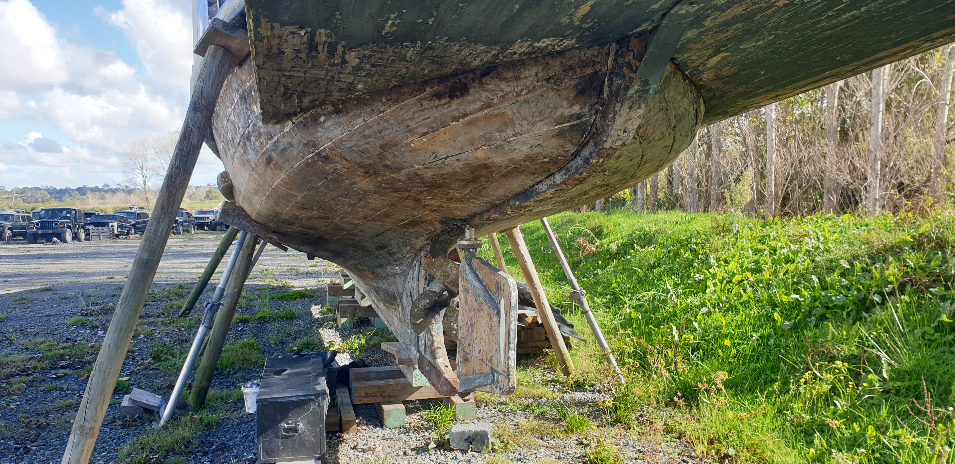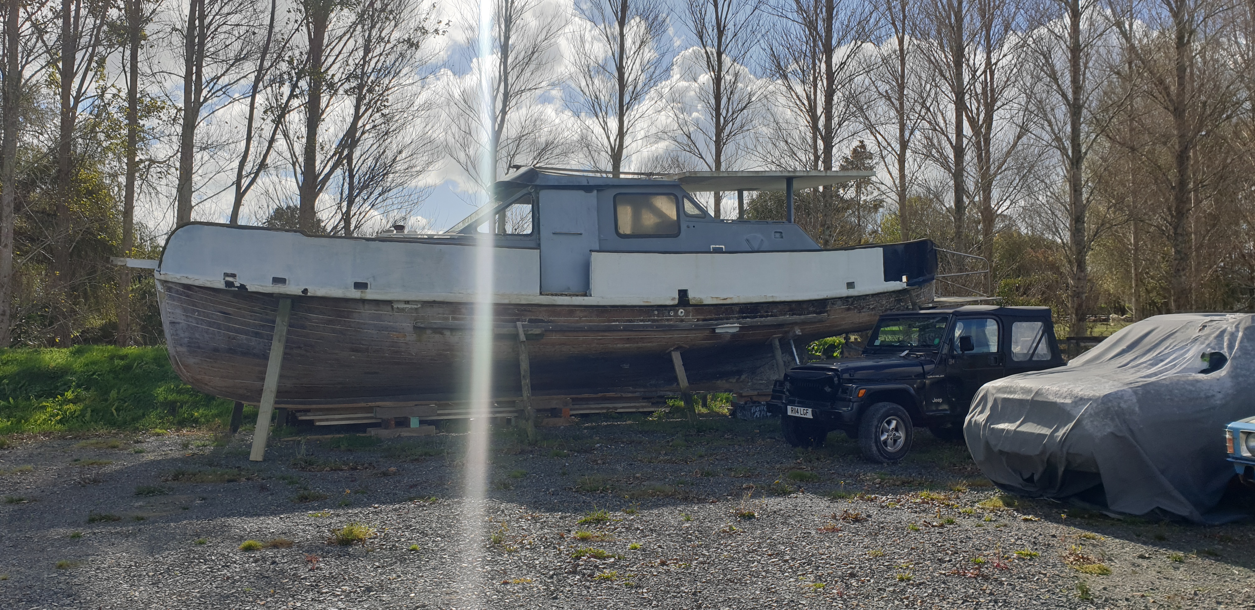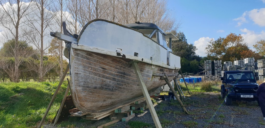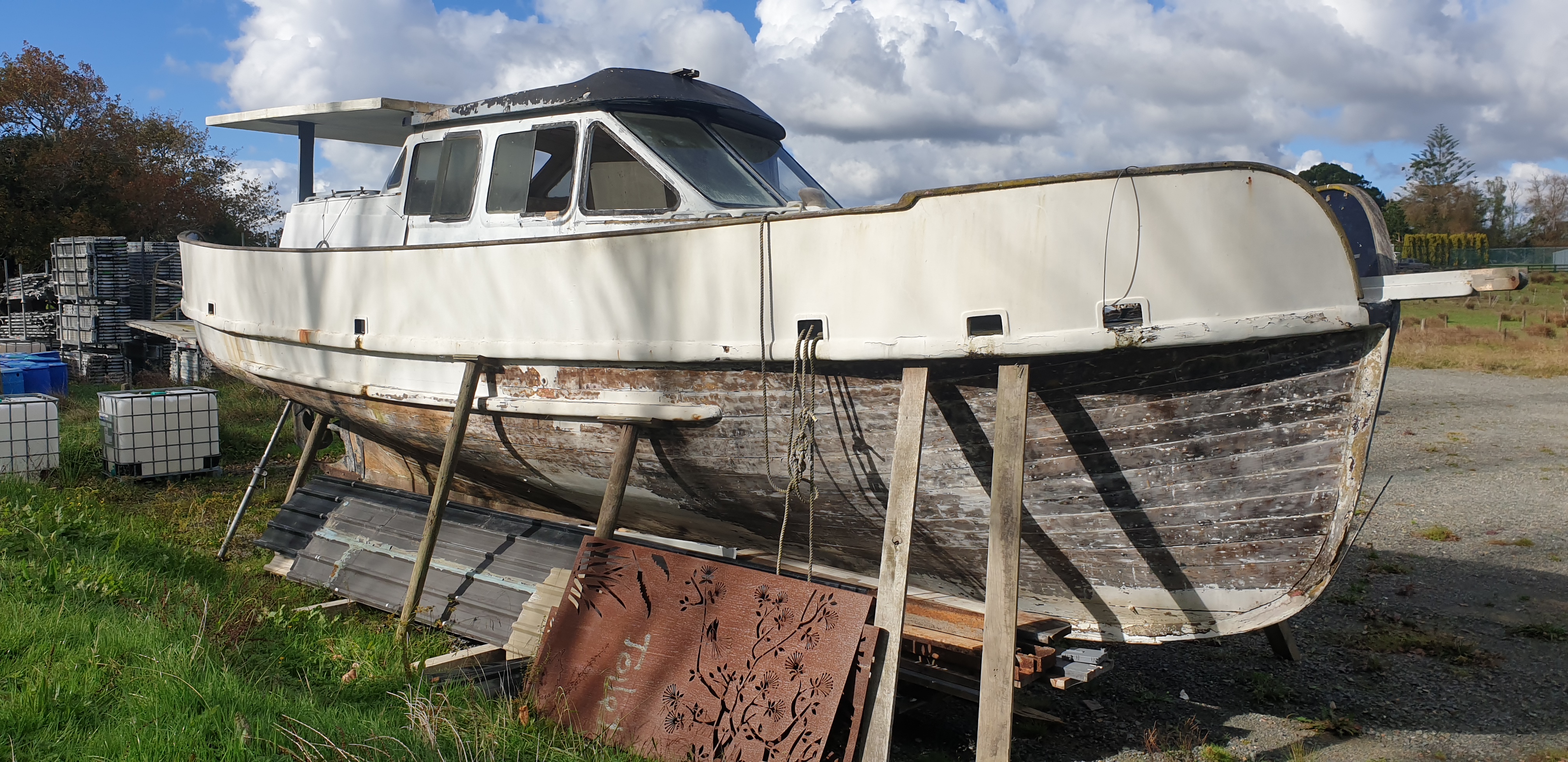 06-11-2024 UPDATE ex John Bullivant – an update on the boat in the storage yard, by the North Shore airfield. Still there, (now on its’ lonesome) and with a big for sale sign painted on the side. Haven’t heard anything more from the guy who was trying to buy it. Looks like a lot of work but maybe good for someone wanting an older style hull as a starter.