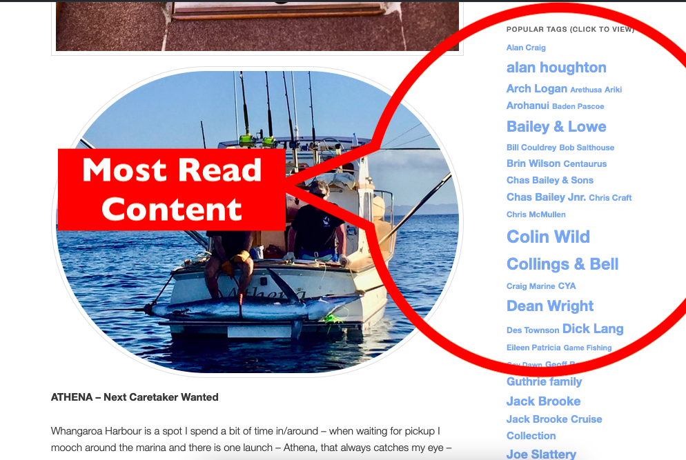 MOST POPULAR CONTENT – Select by tag e.g. boat size / year / type of vessel – yacht/launch/work-boat etc. Note: the bigger the size of the text, the more popular the subject