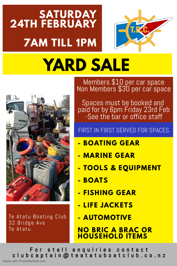 REMEMBER – YARD SALE AT TE ATAU BOATING CLUB SATURDAY