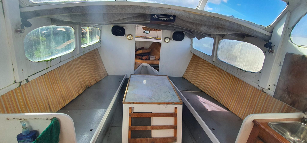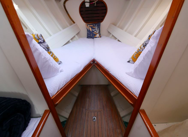 When you view Katherine, her lower hull is glass and from the green section up she is wood – the best of both worlds in terms of water ingress and maintenance. Katherine was purchased in Jan 2018 by accomplished professional boat builder Allan Hooper who immediately started reviewing and enhancing the launch, this included designing and adding the rig and a lot more mods. I challenge anyone to show me a sub 40’ launch with more internal volume, with the same standard of fit out, there is even sound proofing built in 🙂