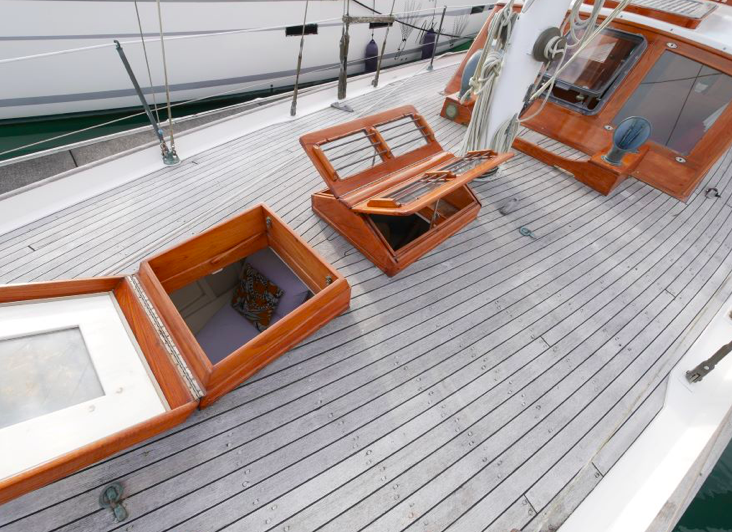 Some specs – 38’ in length, 9’6” beam and draws just 3’. Forward motion is via a Lombardini 60hp diesel engine, new in 2013, this gives Katherine a comfortable cruising speed of 8 knots. A consideration in these days of raising fuel prices, Katherine only sips 3.5L an hour. Fuel capacity is 330L and water 750L. An added bonus is the 6’6” headroom. WW has good readership amongst the serious woodys on the USA WoodenBoat Forum, one of the WBF guru’s once commented on Katherine – ‘Like that, vertical stem, raised deck, spoon stern. What else would you want’.