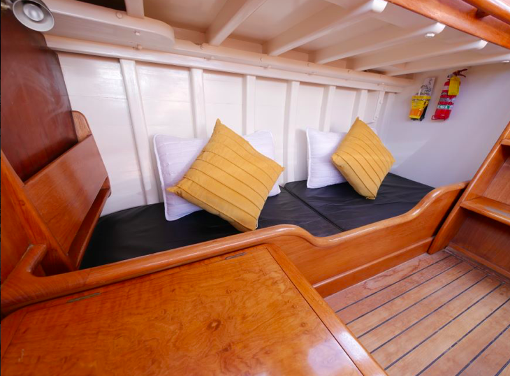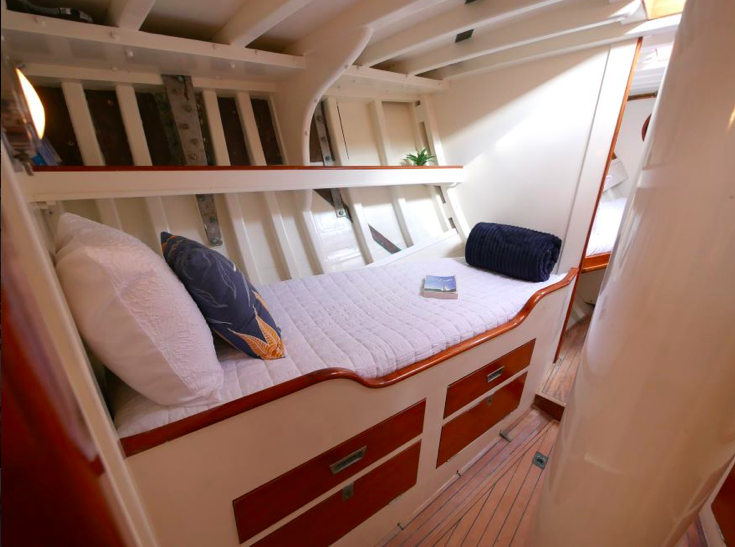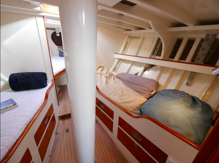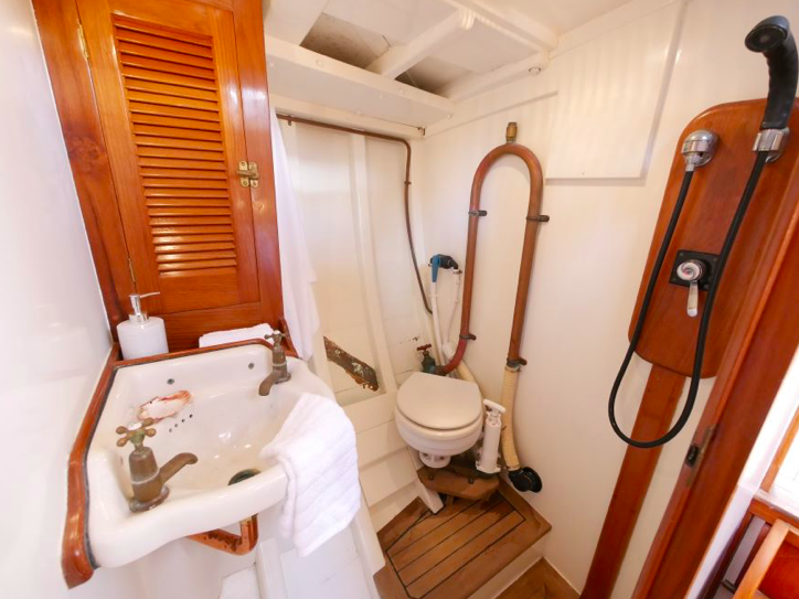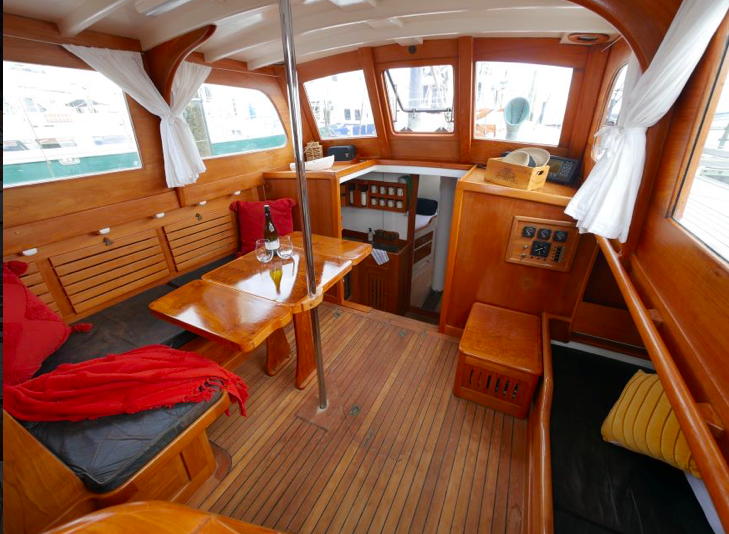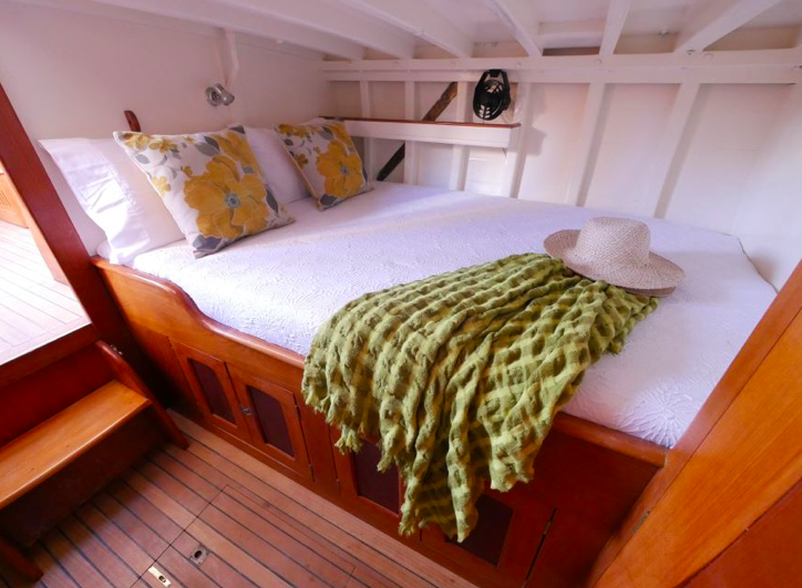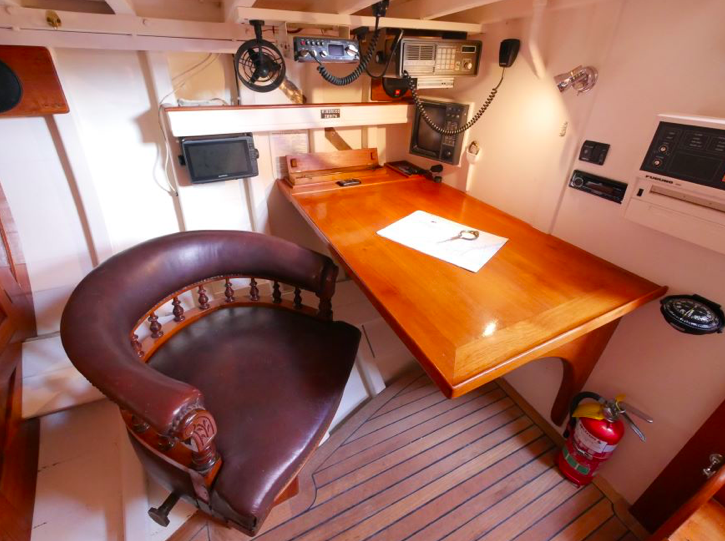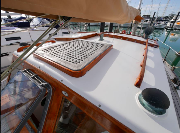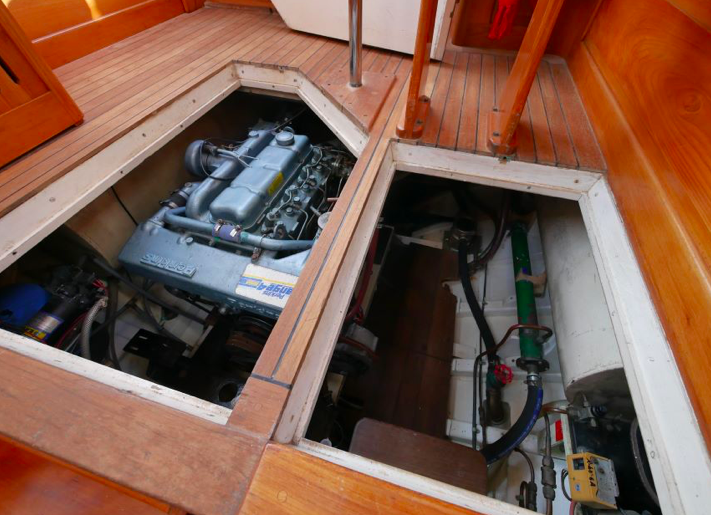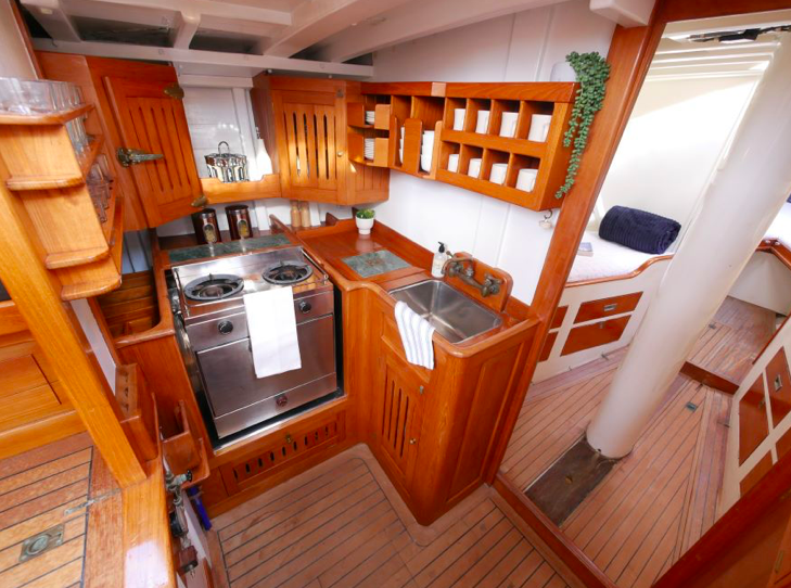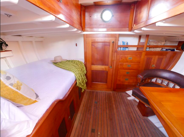 I went aboard several years ago at Mahurangi and she is a very cool boat. Huge volume below, powered by a 60hp Lombardini and sound proofed like a Airbus 340. She measures 38’ loa, with a beam of 9’6” and draws 3’. The Lombardini pushes Katherine along at a comfortable cruising speed of 7.5kts.