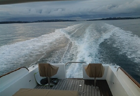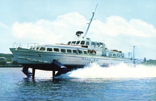This craft was the Auckland based passenger ferry MANU-WAI, which provided the first high speed passenger services to Matiatia Bay at Waiheke Island, & also to Pakatoa Island, in the Hauraki Gulf. The engine was based on a marinised aircraft engine of around 1400HP., with engine revs governed to around 900rpm