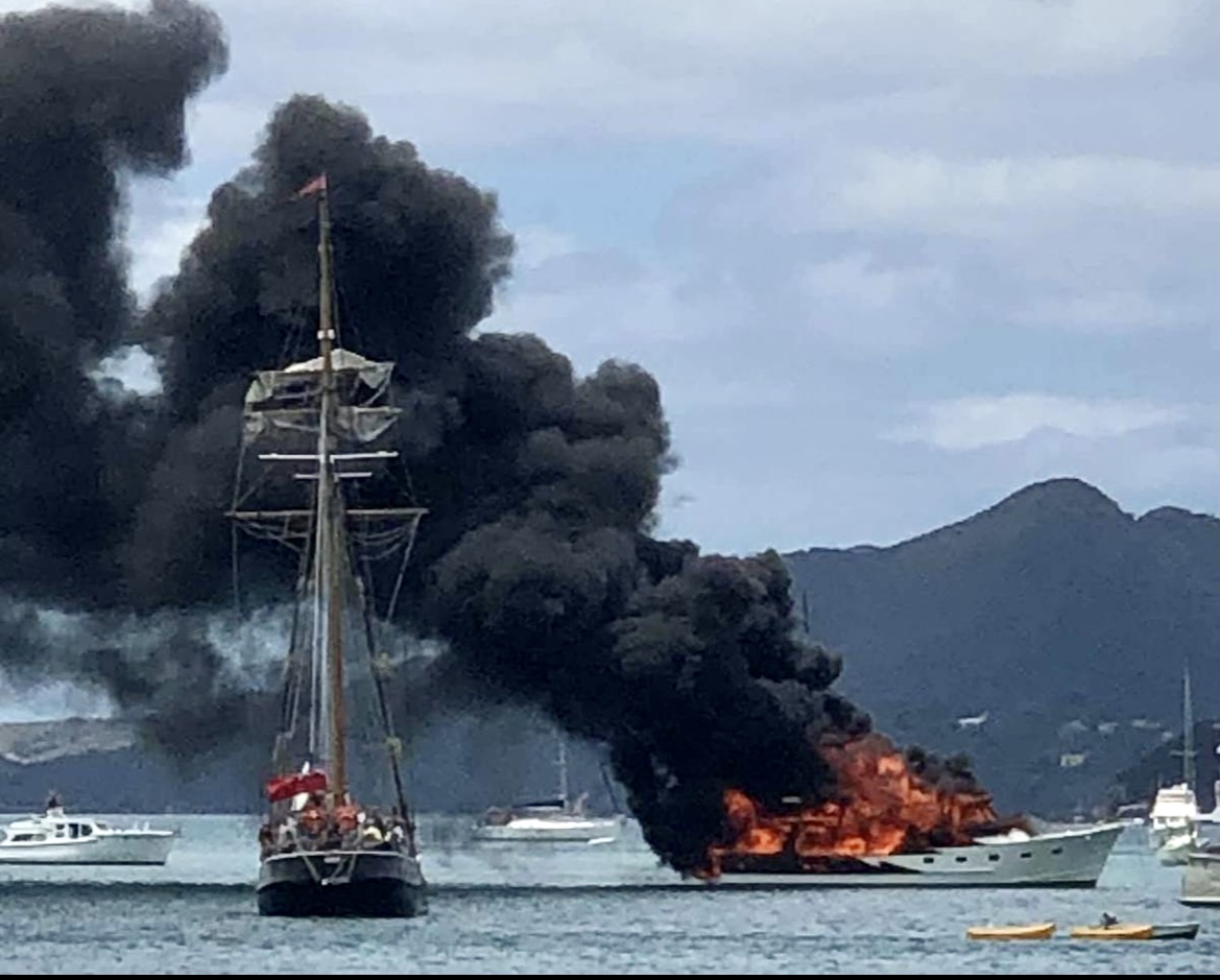 The photo below was sent in yesterday of a Flemming 55 on fire at Opua, be careful these holidays accidents happen so easily on a boat. In the 2nd photo (NZH) there is a woody on the left, all that smoke would not have been pleasant i.e. melting plastic 😦