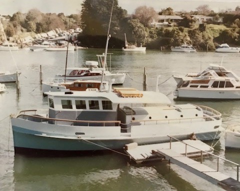 Retired boatbuilder Kerry Lilley sent in the photos above of the 52’ workboat – TE KAUIA, which he built in 1978 in Panmure. Kerry built TE KUIA for Harbour Transport, Tauranga which at the time was part New Zealand Forest Products. Her role involved ferrying workers to and from Matakana Island, towing log barges, and other duties and the occasional fishing charter.