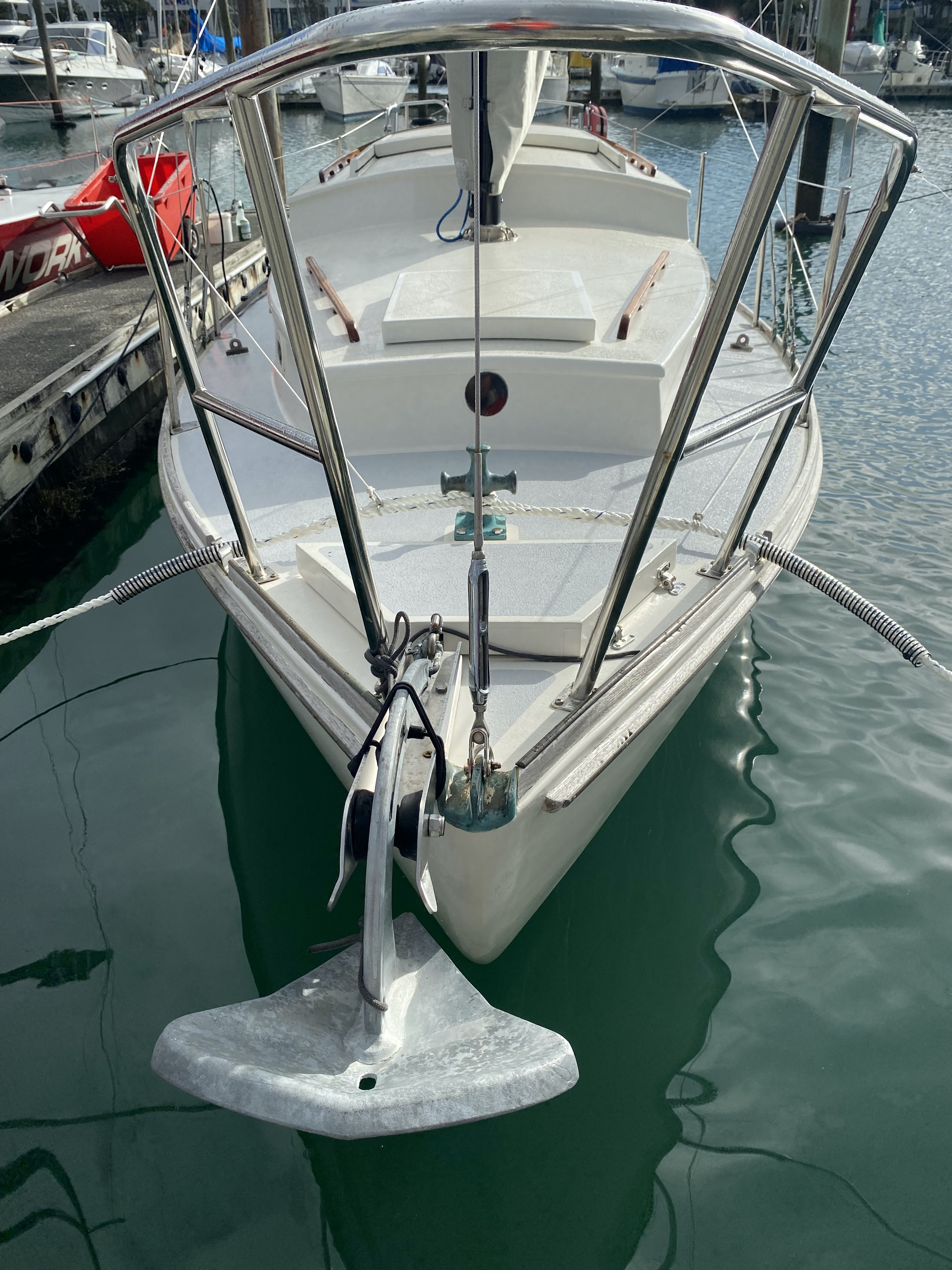 Eddie undertook a refit that included new hydraulic steering. new auto pilot. new water tanks and refrigeration system. The addition of a Sea Wasp 230 volt gen set. Updated electronics including JRC radar and a Walker sat nav. A new tallow wood keelson was fitted by a shipwright at Newport Anchorage. The boarding platform was also replaced. The hull had the paint build up burnt off and was repainted in the shed at the Marina. New stainless steel pulpit and pushpin was fitted. A Muir electric anchor winch was installed.