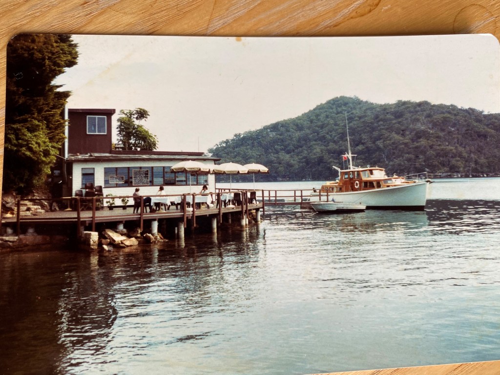 Pittwater N S W 1983 Trinidad for sale Sydney 1983 Boating Aussie style. Moored for lunch. Cottage Point boat shed cafe. Hawksbury River NSW. B.O.I.