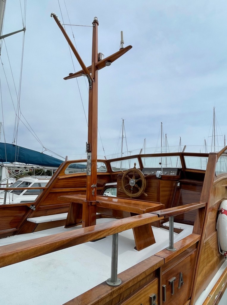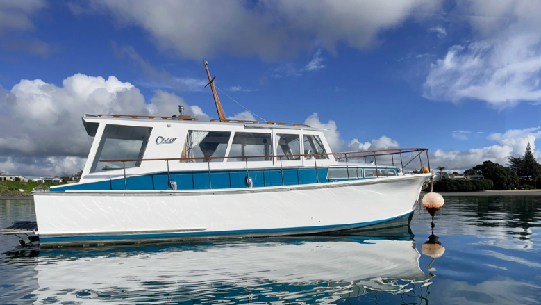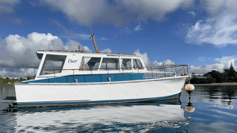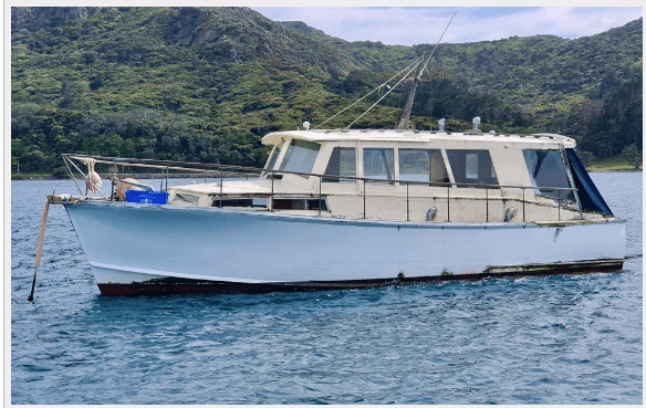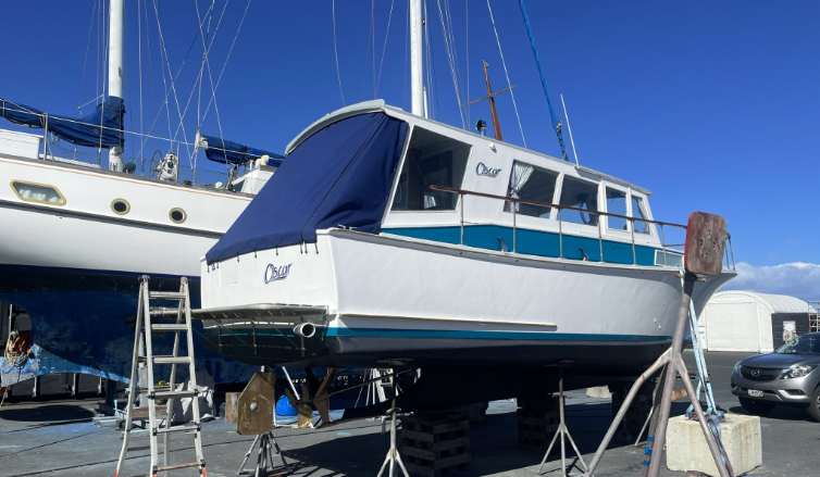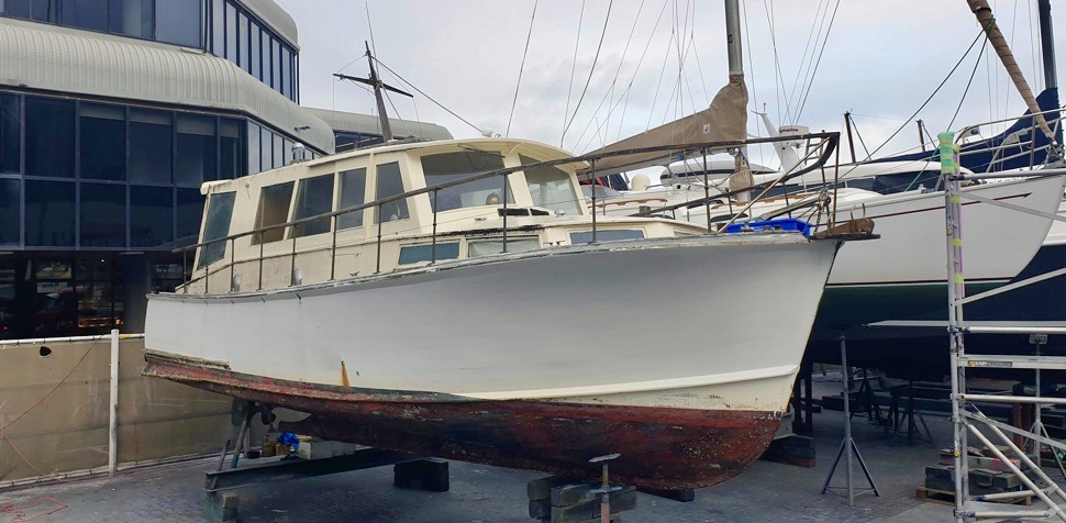 Back in May 2022 Oscar made an appearance on WW, link below to that story, back then she was in a very sad state and being offered for sale via ‘As Is Where Is’ condition.At the time we learned that the 34’6” Oscar was designed by Sam Ford and commenced the build c.1968>70. Sadly Sam passed away and his son Trevor completed the project. When launched the she was named – Shimca’. 2022 WW Story https://waitematawoodys.com/2022/05/01/classic-boat-barn-find/