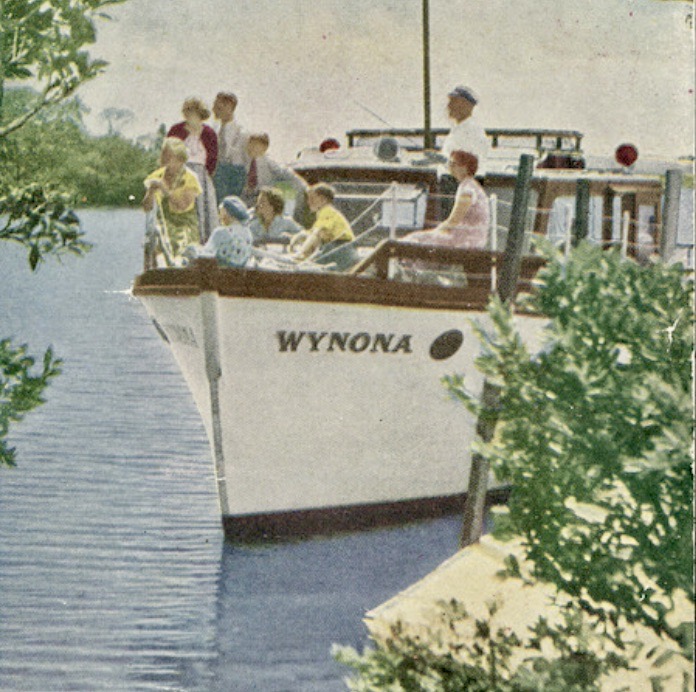 From previous WW stories we have learnt (thanks Harold Kidd) that Wynona was built in 1948 by Sam Ford for the Rotorua Lake Service Ltd., who used her for tourist trips to Mokoia Island in the middle of Lake Rotorua. The colour photo of her c.1950’s is from the front cover of a brochure promoting the trips.