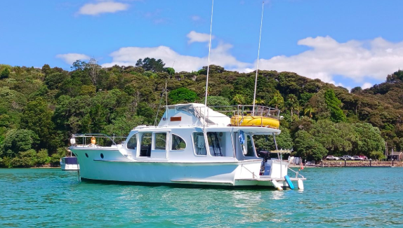 Was built by the Lane Motor Boat Company (Panmure) in 1960. Kauri carvel planked, 44’6” in length with a beam of 10’5” & drawing 4’3”. She is powered by a 120 hp Lees Marine Ford. The addition of the fly bridge / 2nd helm has been done by someone with a good eye & does not clash with the original Lane lines, the same can not be said for the bimini. I’m sure its very practical but does it need to be so tall.