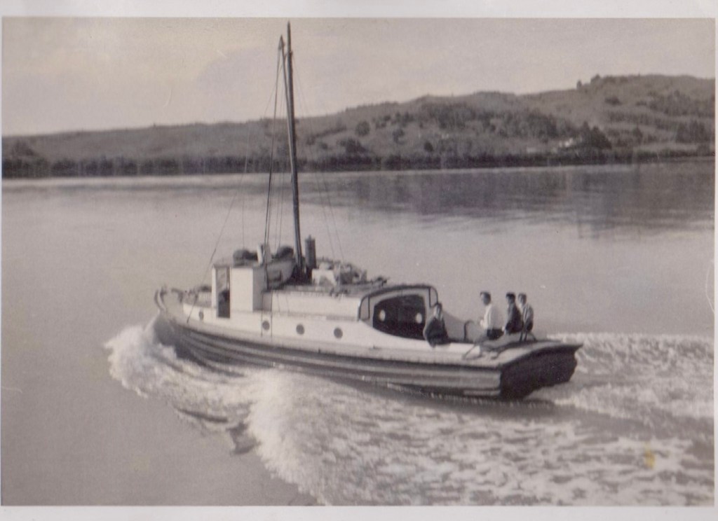 I received today’s photos recently from Ngaire Slade, her father was Dick (Henry Richards) Slade. Ngaire commented that she wished that she had learnt more of the histories of the boats that had been the main transport modes in the Hokianga. The Waima was a boat that Dick owned until sold in the 1980s and retired. Waima then went over to the East Coast and Ngaire understands it was left for years in the Manukau Harbour till removed and left to decay and disrepair, unfortunately placed in a yard somewhere unknown. It was originally brought from the Subritzky family.