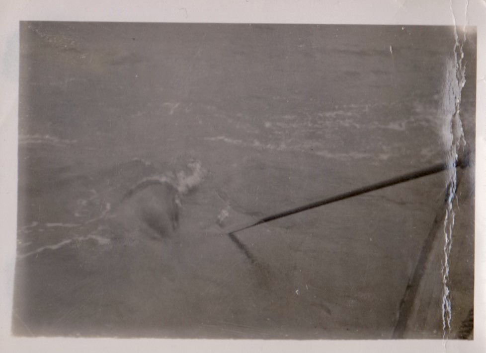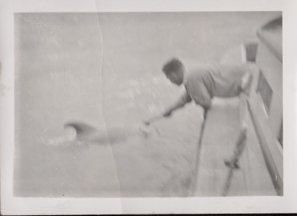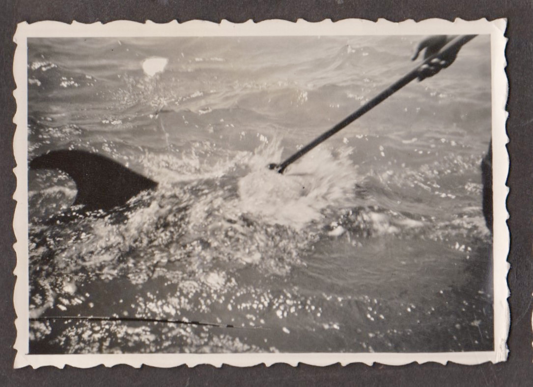 Below we see Dick scratching Opo the dolphin with a mop, she would follow him out to the heads when he would go fishing and come up to Rawene.