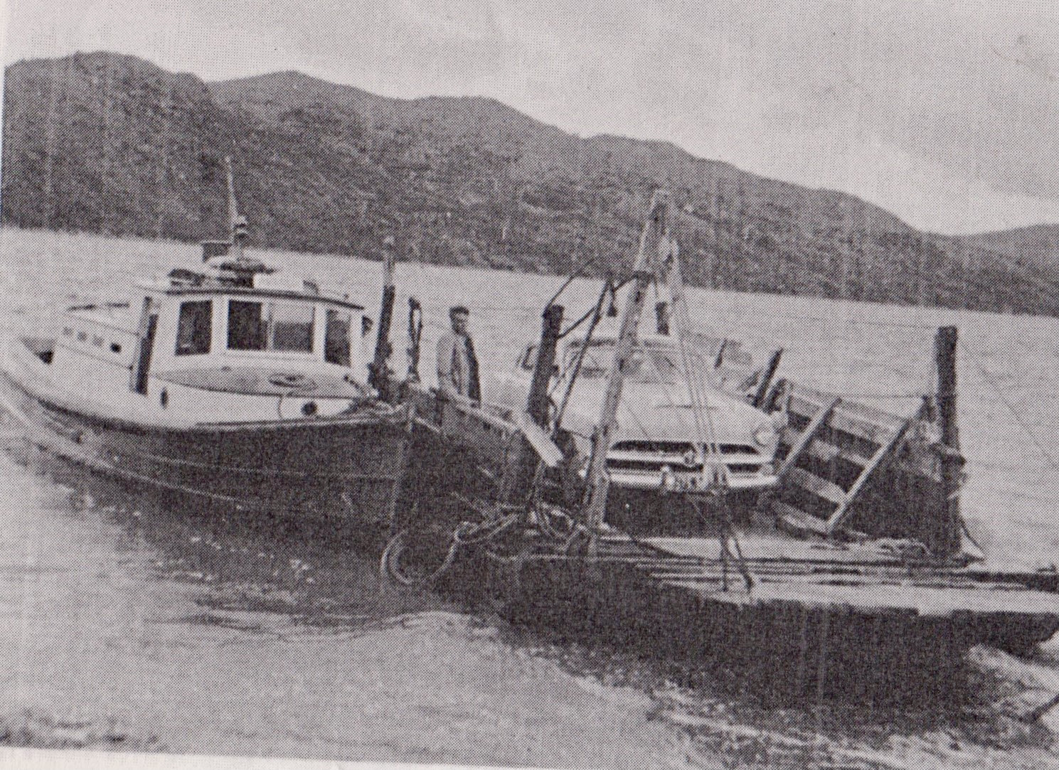 Dick for many years carried the college kids to Rawene High School and did the Cream Run as well before the Dairy was closed. He also carried out the Mail Run on the Hokianga Harbour. In those days, the boats could reach the Mungamuka bridge and up to the Taheke bridge. In the last photo of Waima we see Harry Slade father of Dick and grandad to Ngaire taking a car from Kohukohu to Rawene.