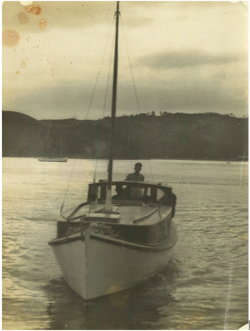 Subsequently, Dec 1951 – ship wrights Angus Henderson and Bill Naggs – built a new cabin to create more head room. They also created the step-up foredeck, and added the lead board on the bow. This was built of Kowhai timber and each rib in the boat was replicated – doubling the ribs in the hull to strengthen for the extension, and a bronze rudder was cast in Whangarei. At this time too, a 4-cylinder Ruston Engine was fitted.