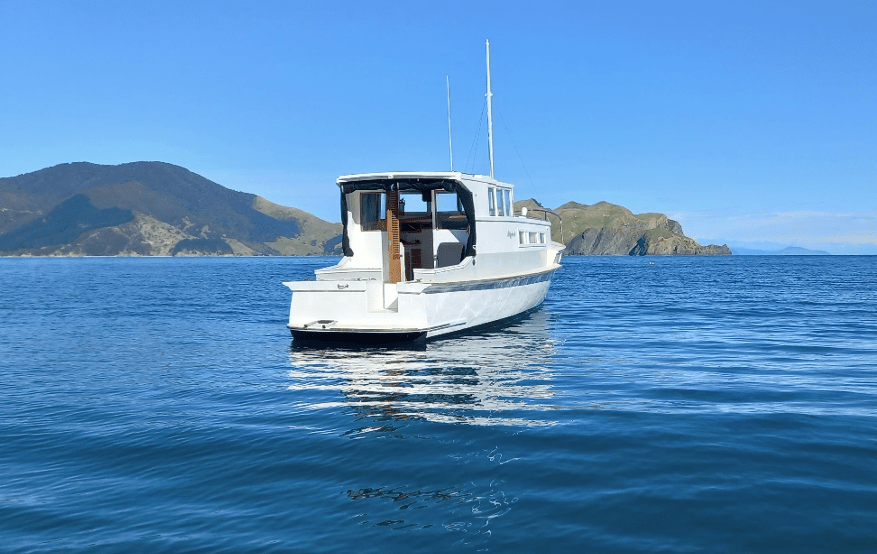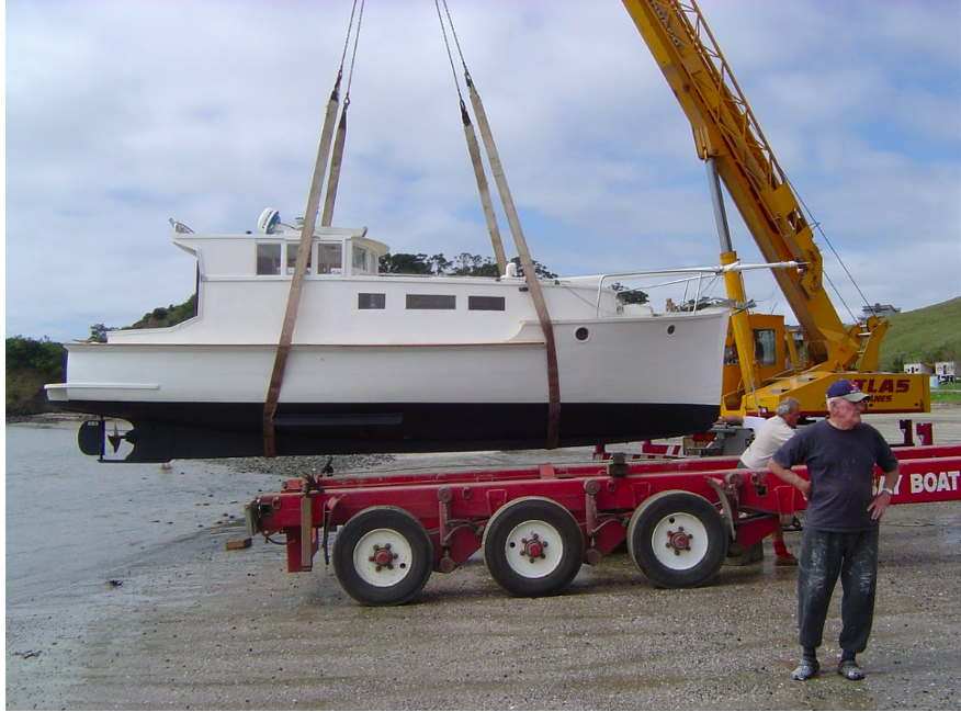 This is when Brent and Sarina Gribble took over the project, and with the help of widow June Tonks and close friend of Vern’s and Brent’s – Steve Ekman, they completed the refit, and in June 2008, she was launched on the beach at Oakura at low tide – going back in the water for the first time in 23 years. After a time, Brent took her to the Outboard Boating Club, onto a swing mooring in the Okahu Lagoon, and as mentioned, I purchased her and kept her there before moving her in 2019 to her current berth in the Waikawa Marina in the Sounds.
