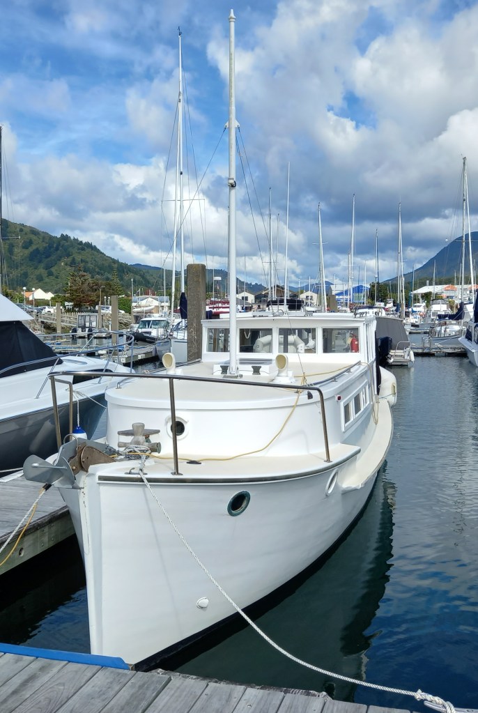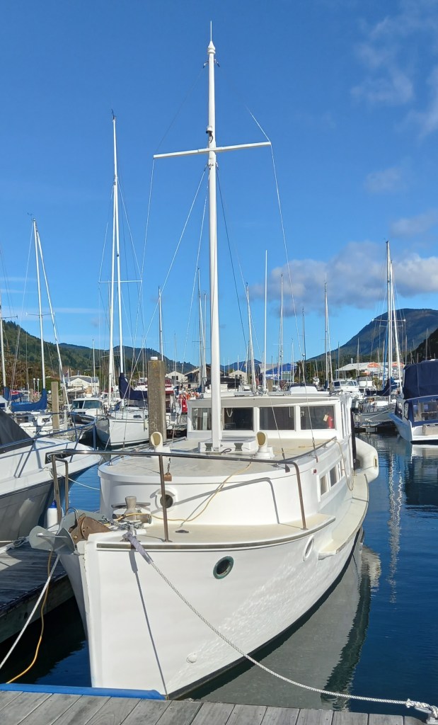 Then there’s the tides. It is a strange spectacle seeing enormous surface turbulence above depths of 50 plus metres, and for a Gulf boatie, being above 140m depth less than half a click offshore seems most peculiar. Then there’s the challenge of anchoring. Most boaties here rely on the network of club moorings because the magnificent hills of the Sounds, tend to go straight down. The Gulf is blessed with great bottom for anchoring. The Sounds are not! And finally, the water temperature…where I habitually dropped the pick in one of many bays in the Gulf islands and dived over for a decent swim, here, on a blistering hot day in mid-summer, one plunges in – and out! But the low temperature probably explains why good antifouling can go a couple of years and need nothing more than a soft waterblast. There are no goddamn barnacles!