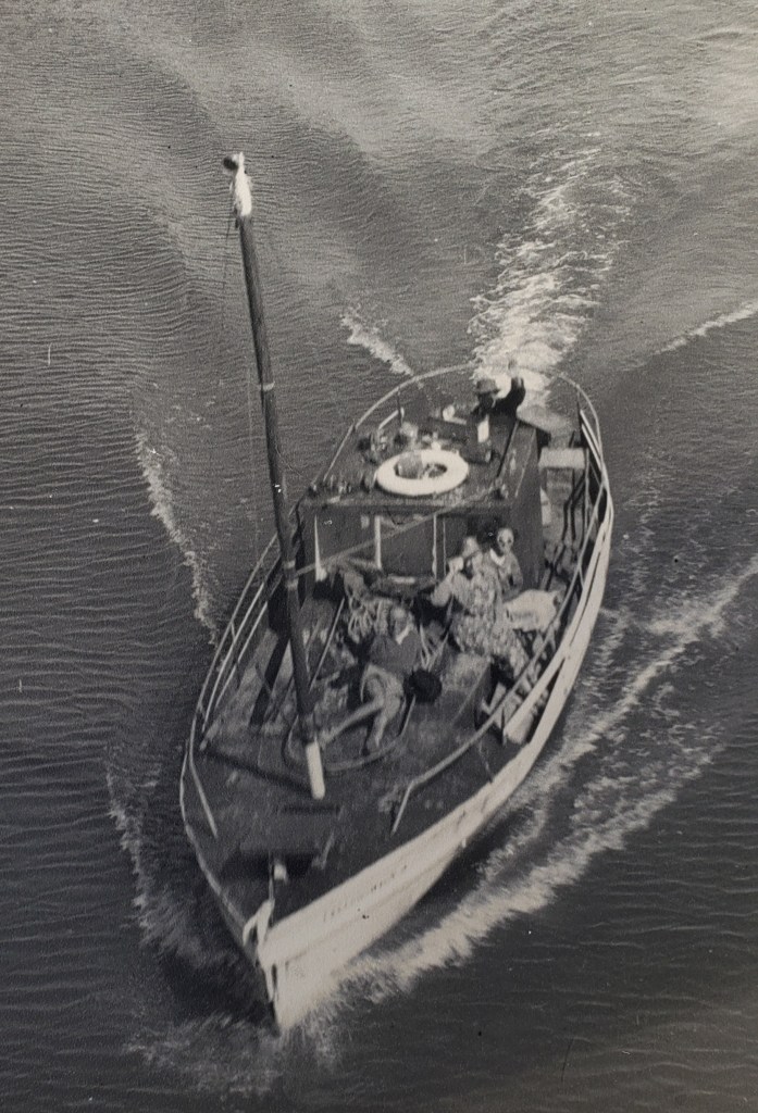 From the photo it appears to be a family day out, with two couples visible on deck / at the helm. An unusual view of the boat, no drones back then :- my guess – she is about to pass under a bridge, on which is the photographer.