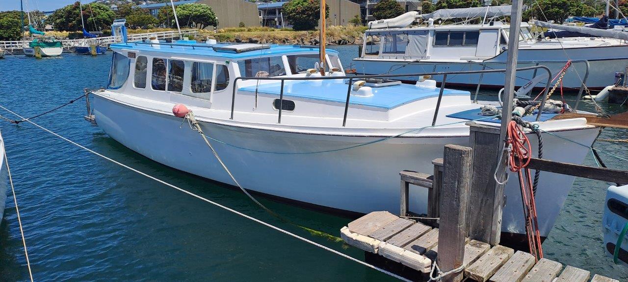 She was re-engined sometime in the 80’s with a slightly larger 85hp 4 cyl Lees Ford and a hydraulic gearbox. Otherwise she appears virtually unchanged, at least in 2003 when the photos were taken. She was a tough little launch and would plug on thru just about any sea. There is at least one sister ship, Yin Yang at Westpark, who has had her cockpit extended. At one time we were told Snow had built up to 6 of this design but this is not certain.”