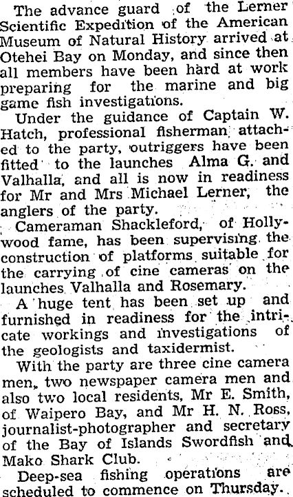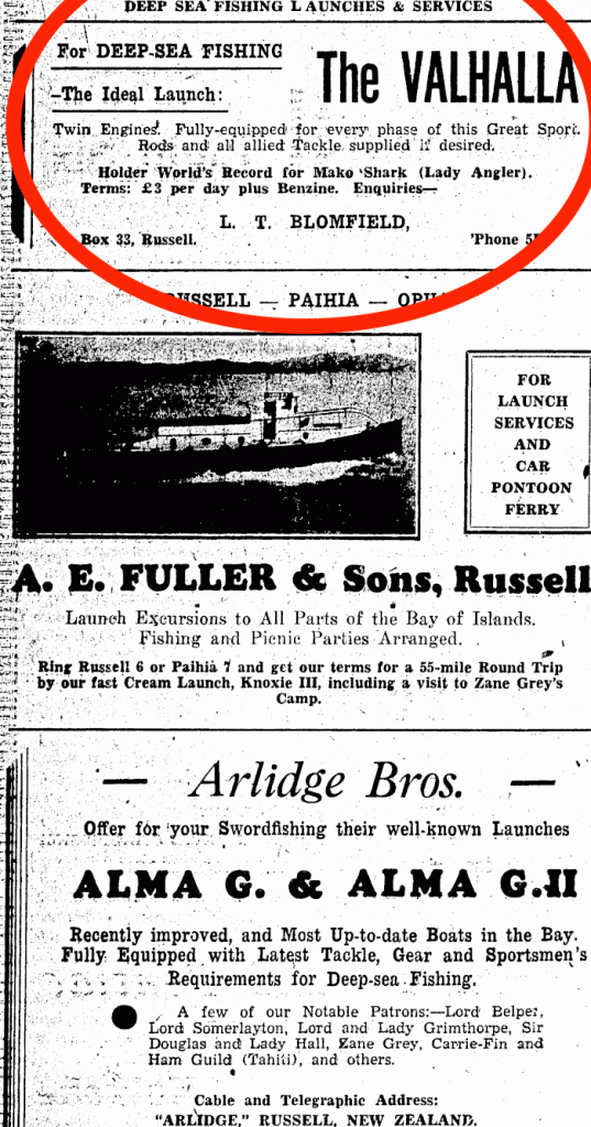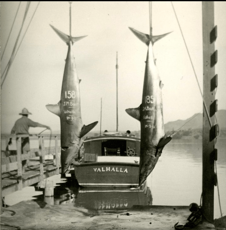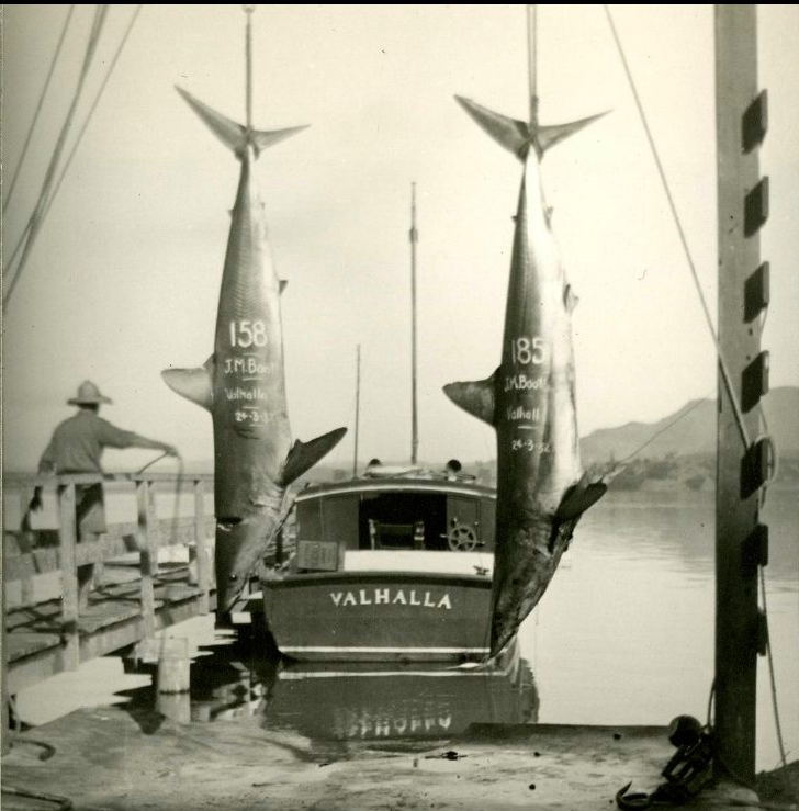 In the above March 1932 photo we see the launch Valhalla alongside the wharf at the Whangaroa Swordfish and Big Gamefish Club in Northland.