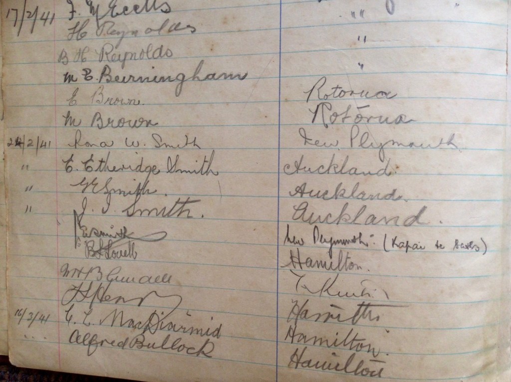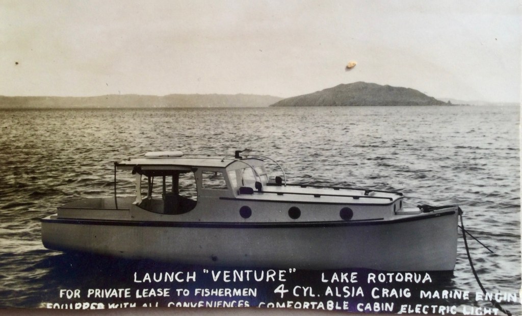 “This is Penny , I met you on the Waiheke ferry the other day and we discussed the fact that I would love to know what happened to my father and grandfathers boat that he used on the lakes in Rotorua as a charter fishing launch . I think that it operated out of the fishing camp on the Ohau channel , and the Harvey family lived in a house on Lake Rotorua on the other side of the channel . As you will see from the above photos the launch was called Venture, and the Log book below begins in 1937 and finishes in 1941.