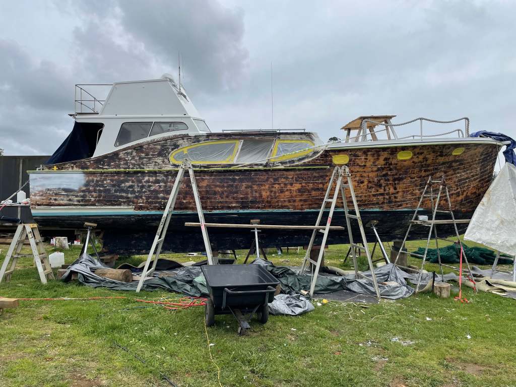 Also hauled was a nice selection of other woodys – see below. Lady Ruby is a very salty looking motorsailer, the double-ender launch I think hails from Bayswater and has grazed WW before but her name alludes me. The sedan / flybridge launch I suspect has a few too many sheets of plywood for my eyes. The classic yacht waiting her turn to be relaunched ? – very pretty.