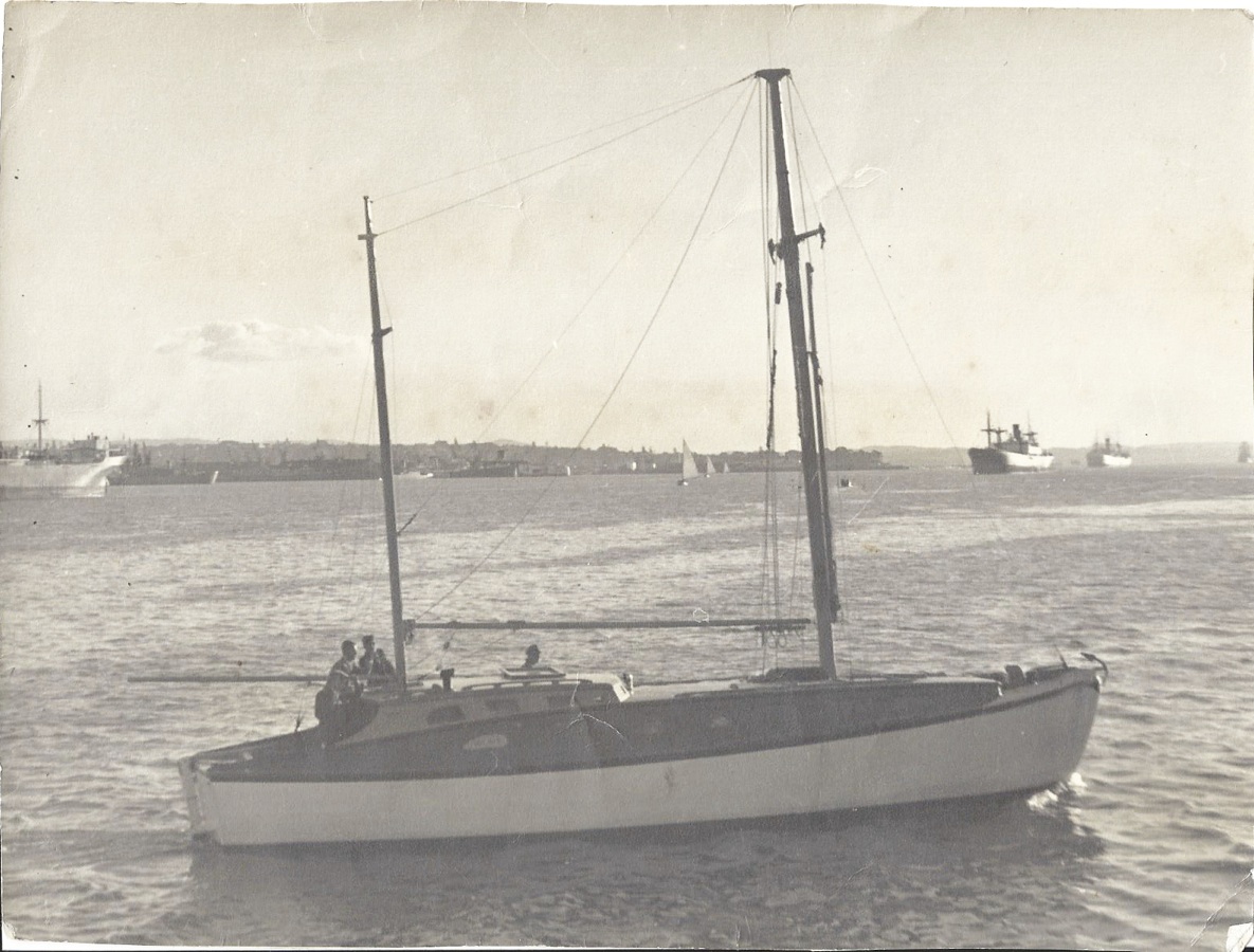 She certainly looks like the 44 footer WAIHAPE which Johnny Wray launched in December 1948, the last big boat he built. He put some unusual features into her. From his RNZAF experience she was fitted out with an aircraft-type control panel and had twin engines, small Kelvins I think. She took him to Tonga and back a couple of times and had a fair spread of sail.