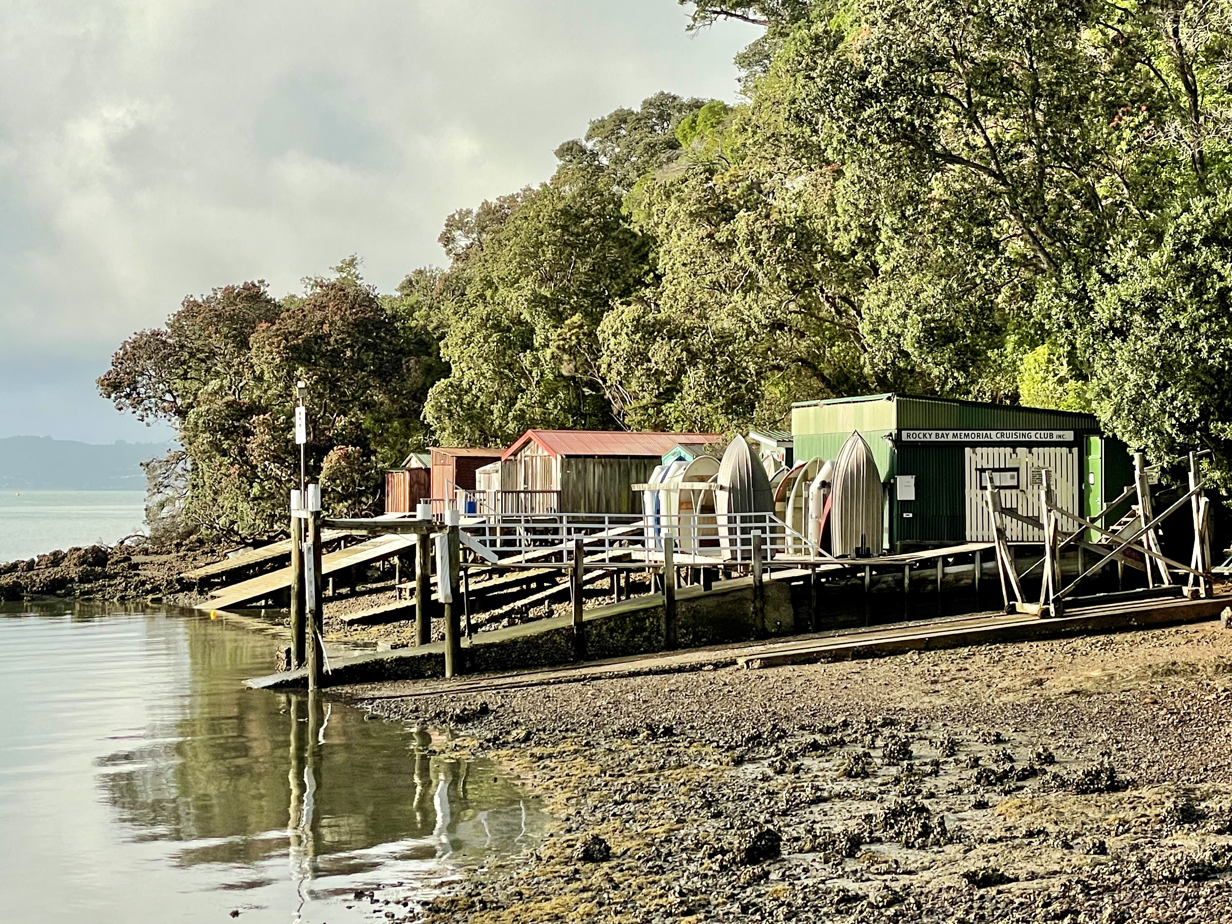 The top b/w photo of the Rocky Bay Memorial Cruising Club at Waiheke Island is dated 1990 comes to us from the Akl Library Hert. Collection via Maurice Sharp – fast forward 30 years and its not a lot different – photo taken yesterday.