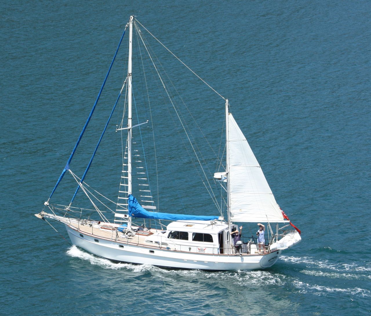 “Sunquest is a beautiful motorsailer that is much admired in this area. She was built by Wally Steer in Nelson and launched in 1959. I remember our family joining others on a Vining & Scott Christmas outing to Kaiteriteri with Wally during the early 1960’s – probably my first outing on a keeler out on the open sea. In those days she was a real looker with light blue hull and the proud timber rope work around the stern painted in a gold colour…still a great looking motorsailer with lovely Alden lines. A shame there were not more built in NZ to this design as they would have been very popular I think. After Wally sold her she went to Mana .. not sure of the various owners but hopefully someone will fill in the gaps and provide some history on this lovely vessel.