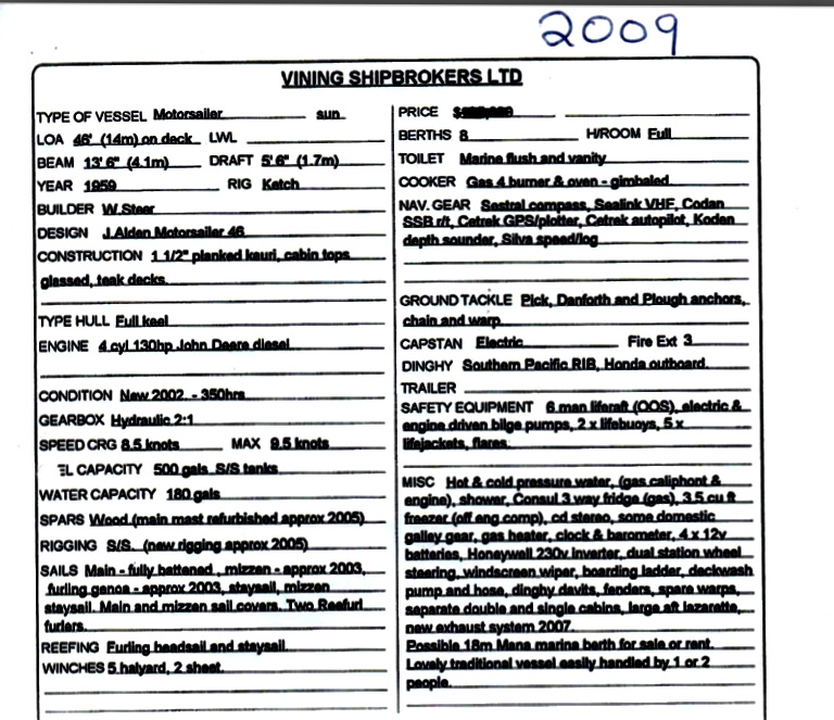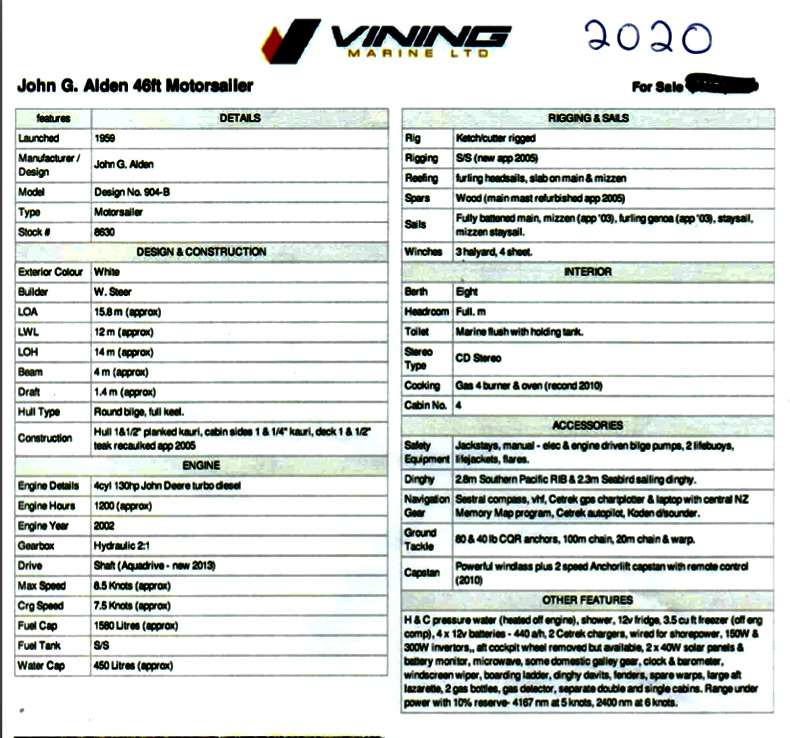 After checking through the archives in the Vining Marine Office Phil came up with a listing from 2009 when they sold her for Paul Robinson to John Mansell. The 2020 listing is from when John listed her (refer below) .. he went on to sell her and now owns the well known Auckland yacht Trojan Eagle. You will see from the listings that she originally had wheel steering inside & out .. the outer wheel was removed at some stage.”