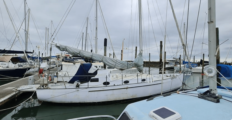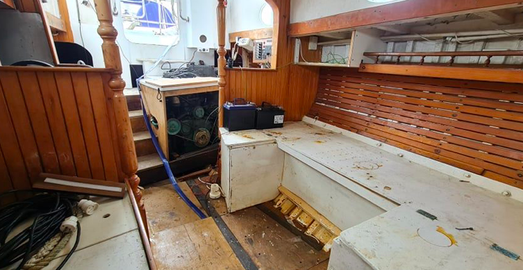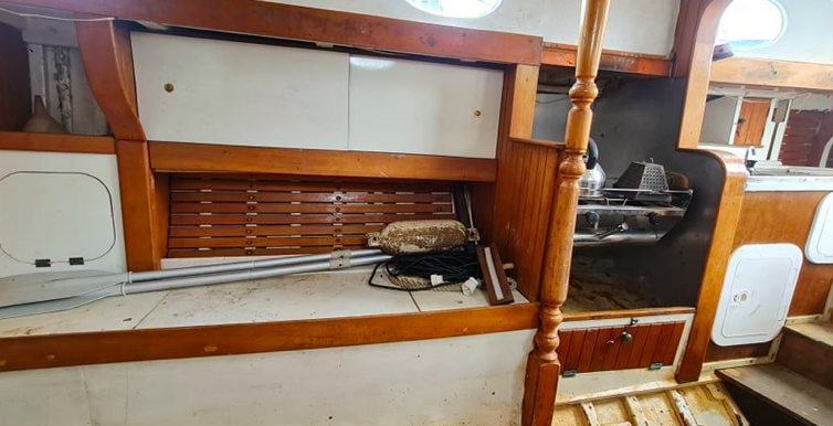“I saw Aurora for sale on Trademe yesterday and I thought you might be interested in seeing these pictures of her. As far as I know Uncle Neil built her himself in Dunedin to a Norwegian design. Dad used to tell me she was built like a brick outhouse and you can see that even though she is clearly neglected, she is still a tight wee ship! The photos and advertisement make her seem much bigger than she is. I think she is only 21 feet long, making her essentially the size of a trailer sailor!