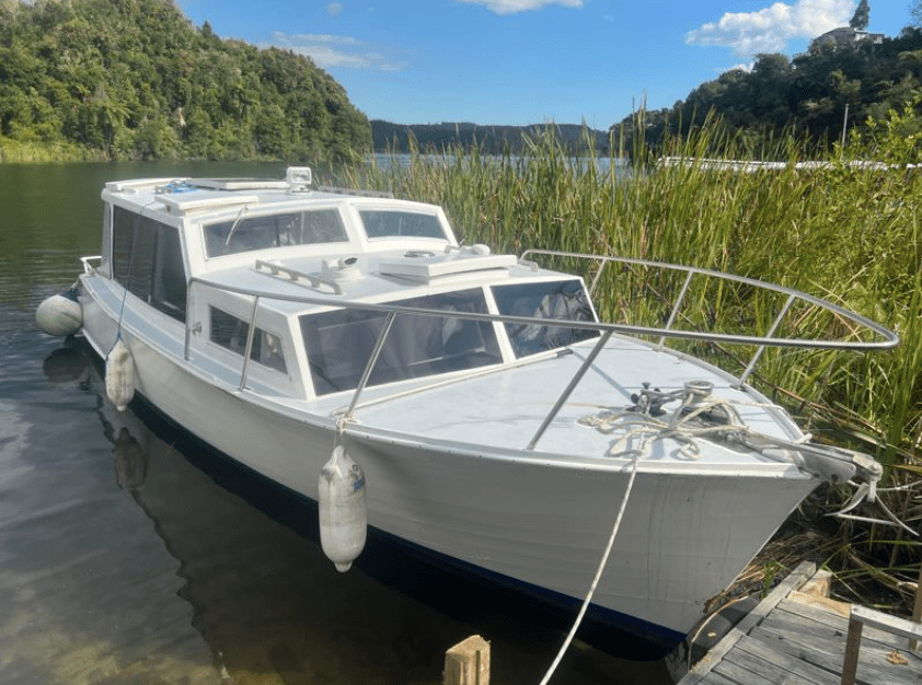 What we are told (thanks IanMcDonald / tme) is that she was built in 1978 and is described as a Woolley 25, kauri planked, powered by a Volvo Penta 28hp diesel engine and calls Lake Rotoiti (Nth Island) home.
