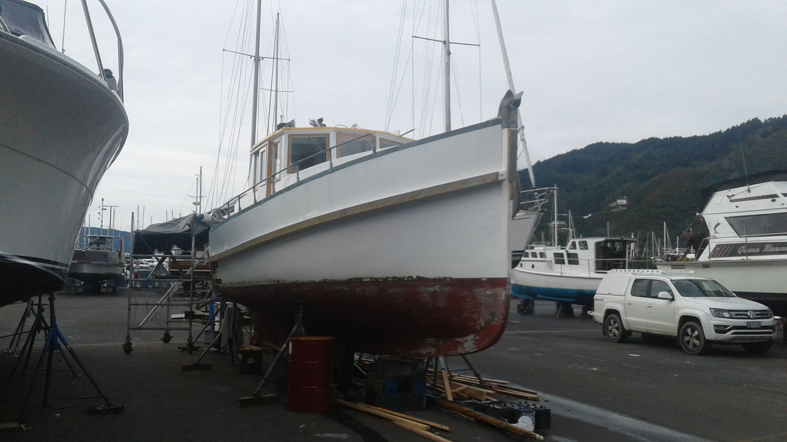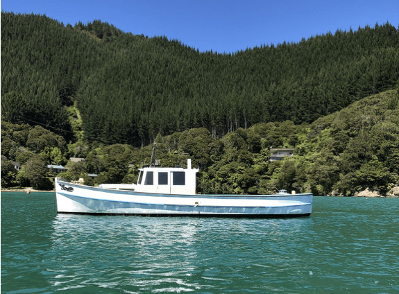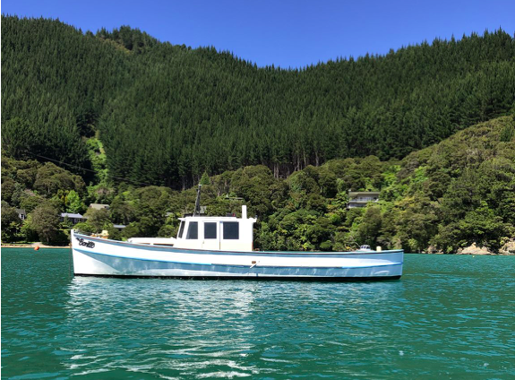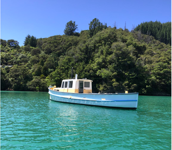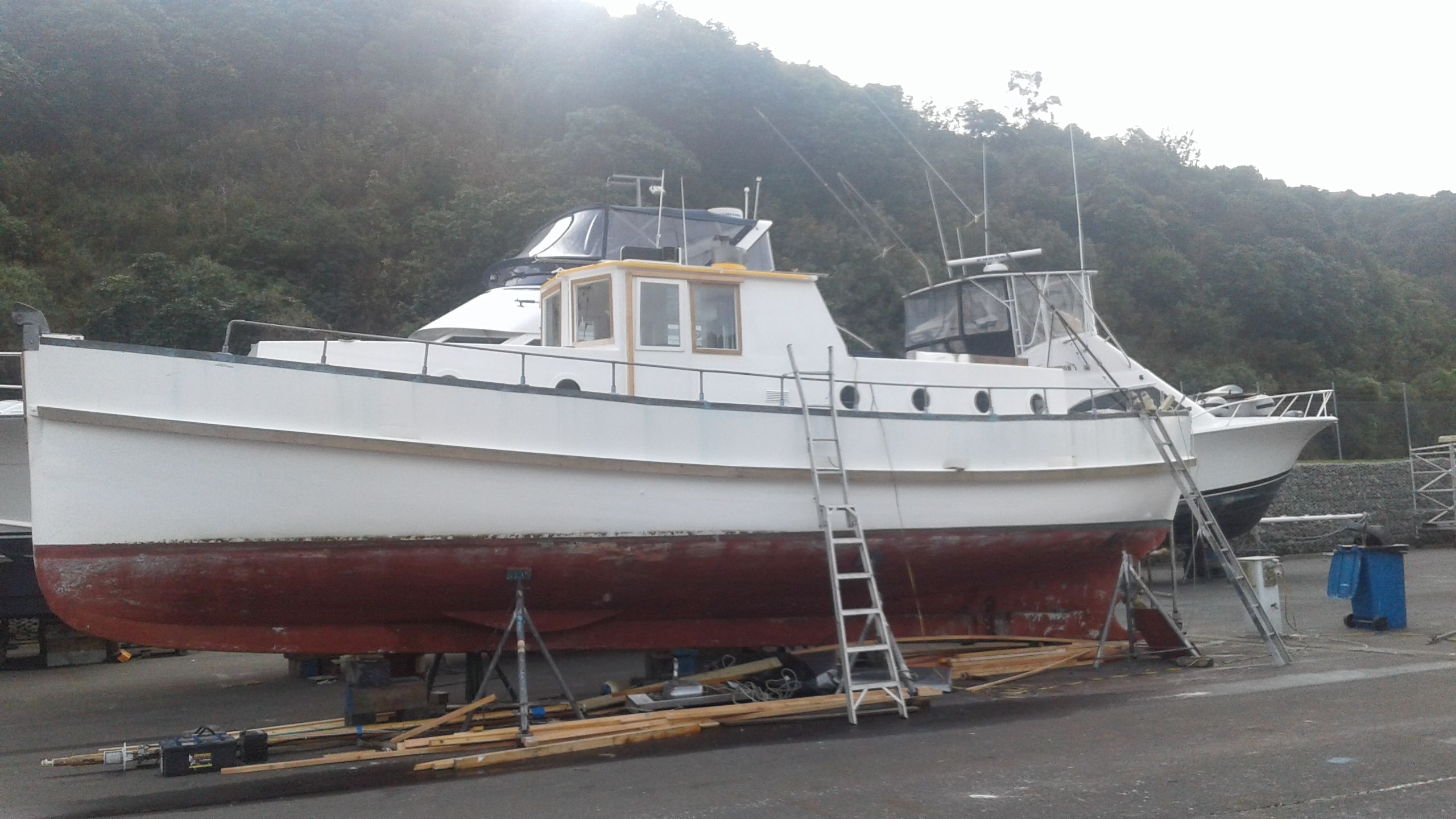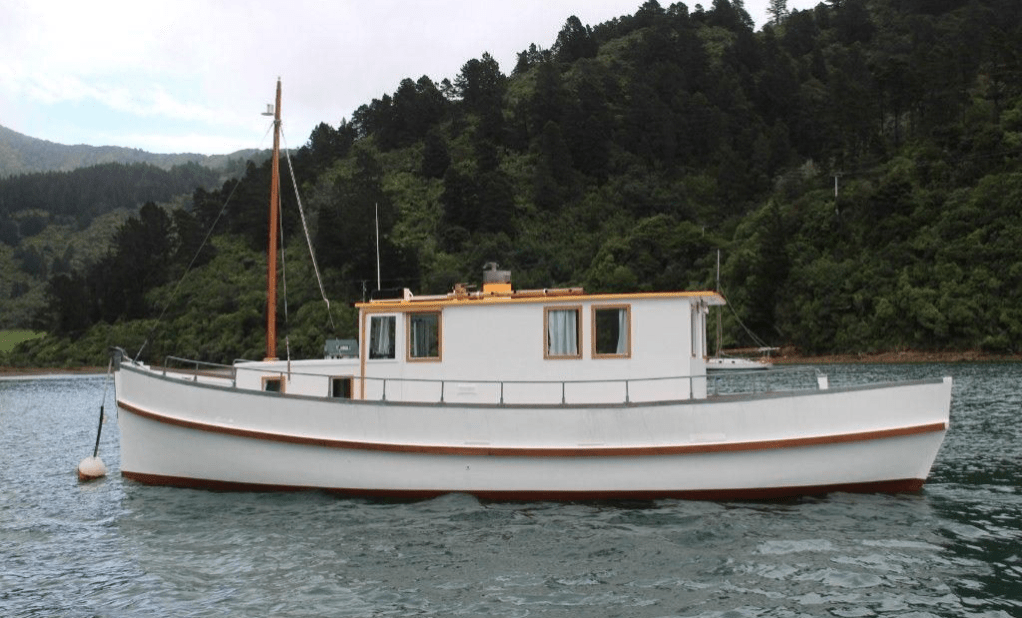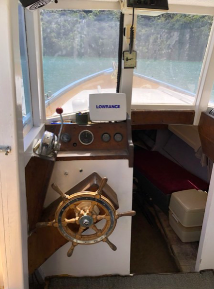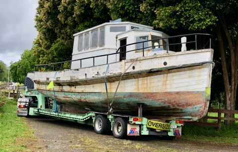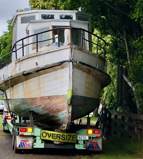 Woody Brett Stanaway has taken his launch Seabee to the Far North this summer, even ventured as far as rounding Cape Reigna. While in Hohora he spotted the above woody. Those rather substantial belting indicate she was / is a workboat. In my eyes, there is a certain whale chaser look to her.No name visible so we will have to rely on the WW workboat boys for help ID’ing her.
